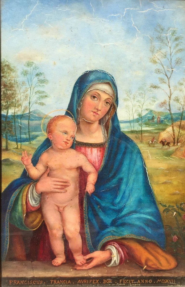 Firma ilegible (escuela europea, siglo XIX). Óleo sobre tela. «Virgen con Niño.» Firmado y fechado «1898» abajo a la derecha. 40 x 26 cm.