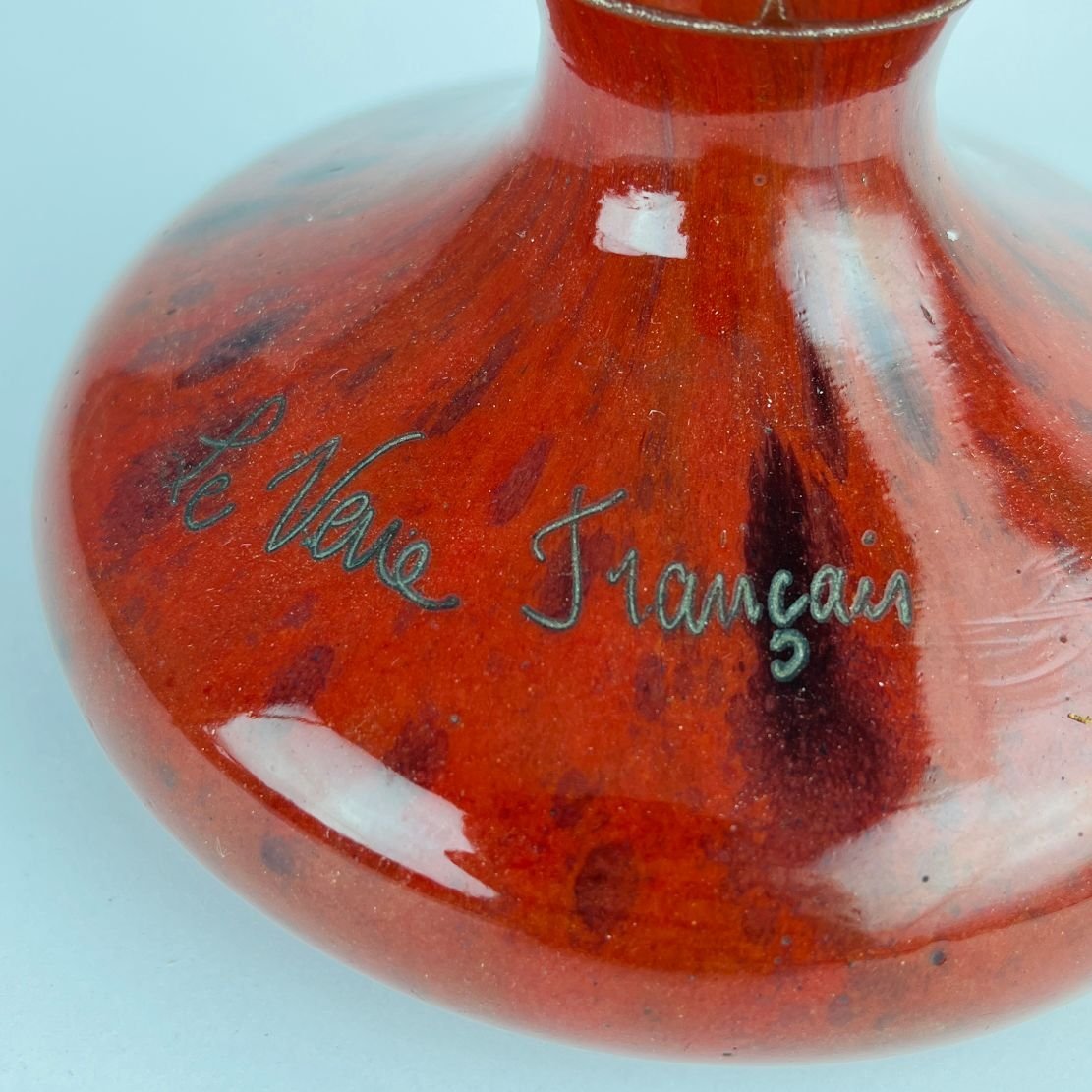 Florero francés en cristal Le Verre en color rojo tallado «flores». Firmado en la base «Le Verre François». Alto 33.5 cm.