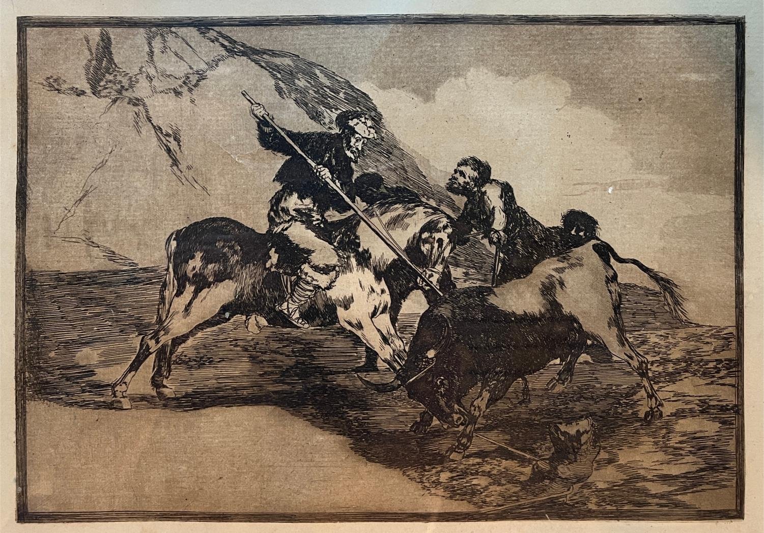 FRANCISCO DE GOYA (Escuela española, 1746-1828). Grabado «Modo con que los antiguos españoles cazaban los toros a caballo en el campo» 25 x 35 cm