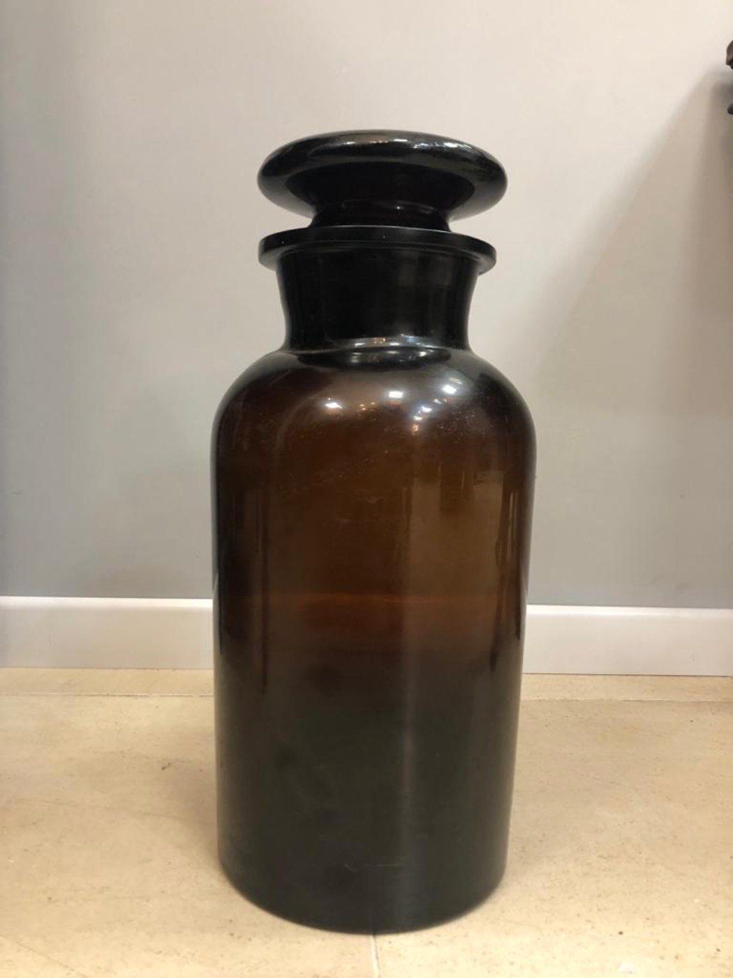 Frasco de farmacia en vidrio soplado color marrón, con tapón. 47 x 20 cm.