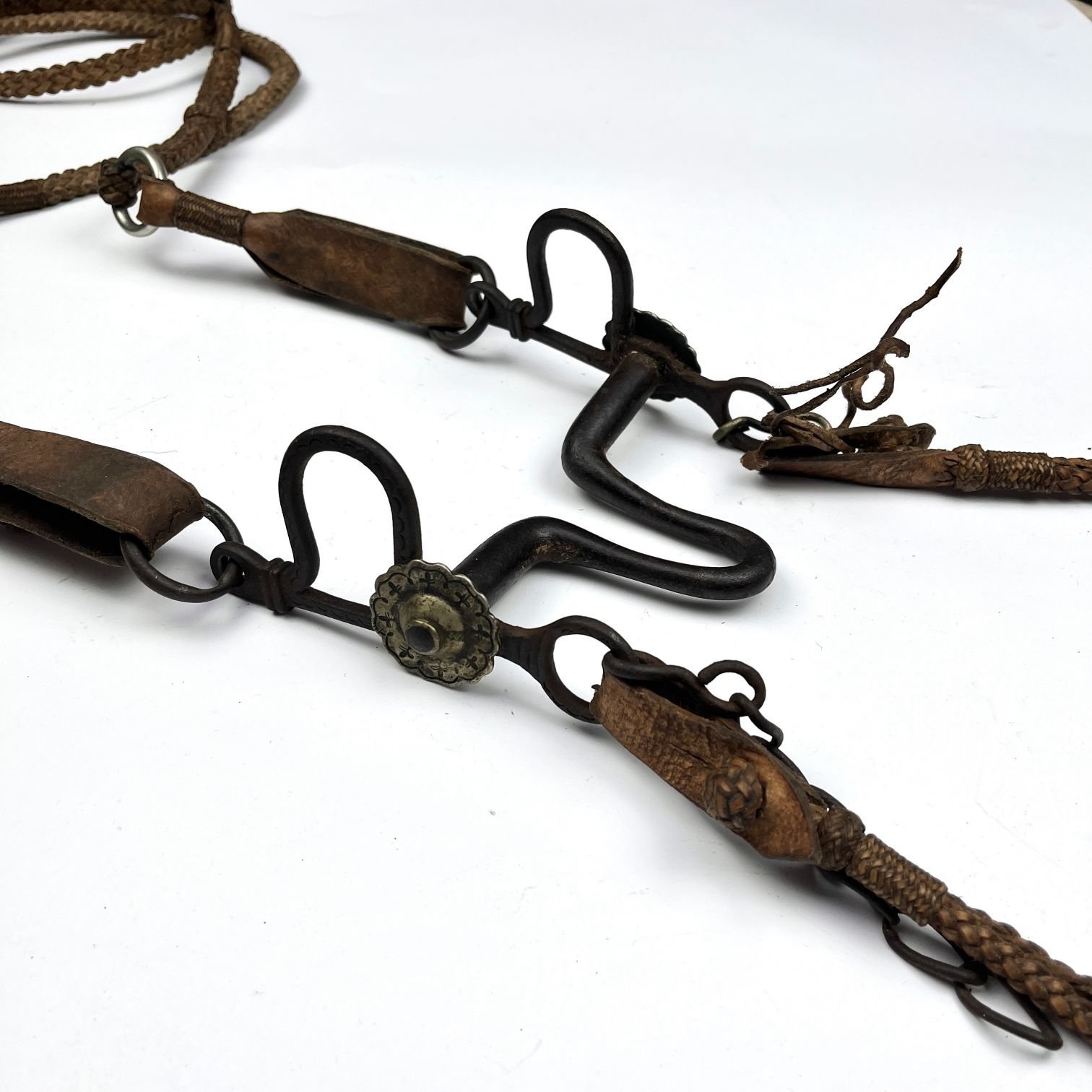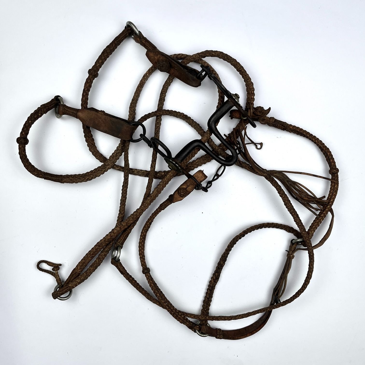Juego de bozal, cabezada de freno, manea, par de riendas y pretal en cuero crudo decorado con fino cuero trenzado, con argollas en metal blanco. Freno en hierro forjado.
