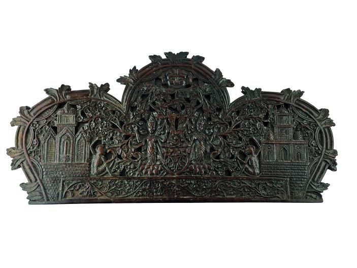 Friso hindú en madera tallada y calada «templos, dedidades y monos». 30 x 63 cm. Pequeña avería.