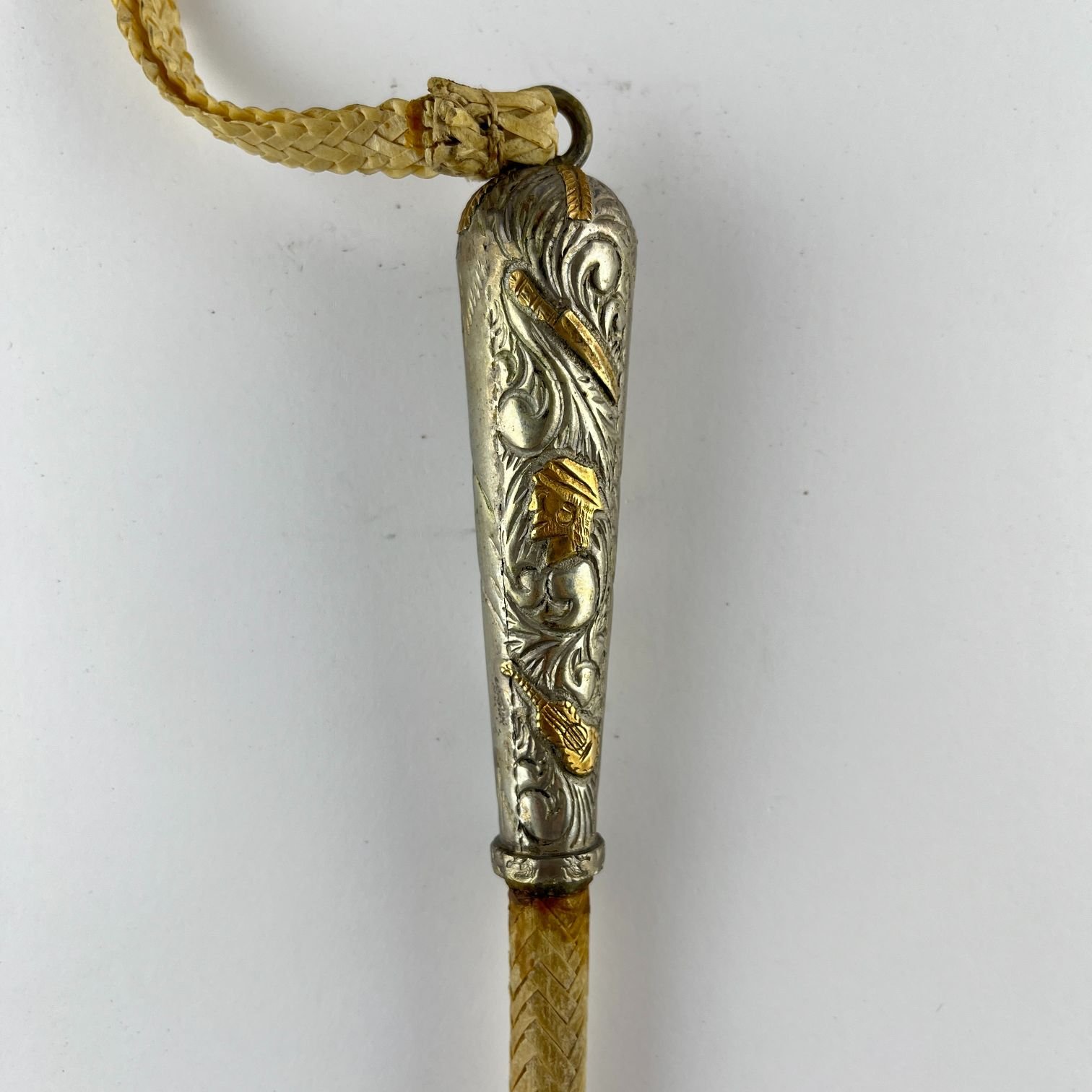 Fusta forrada en cuero crudo trenzado con cabo en plata y oro decorado «motivos gauchescos».