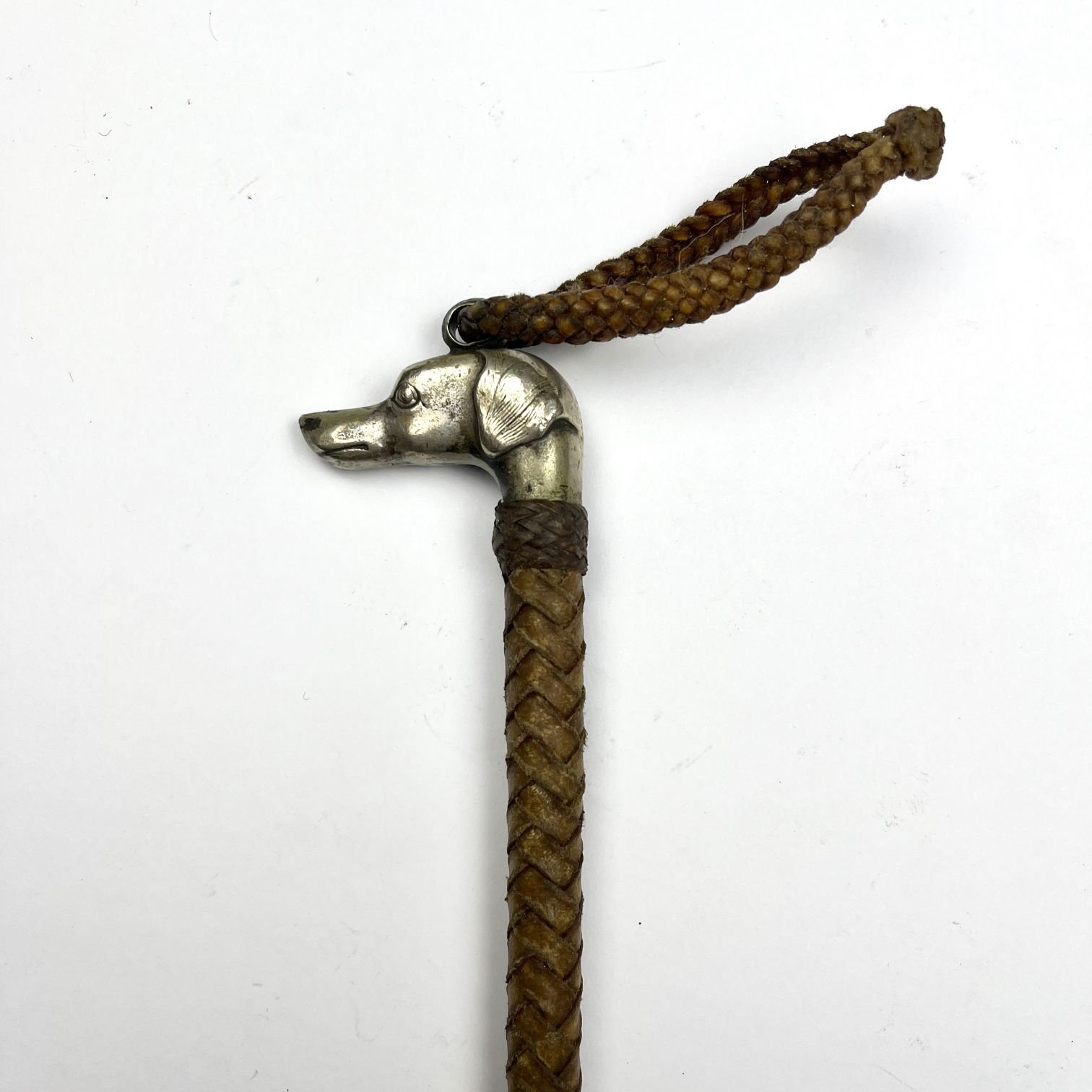 Fusta forrada en cuero trenzado con sotera en cuero crudo. Cabo en metal blanco esculturado «cabeza de perro».