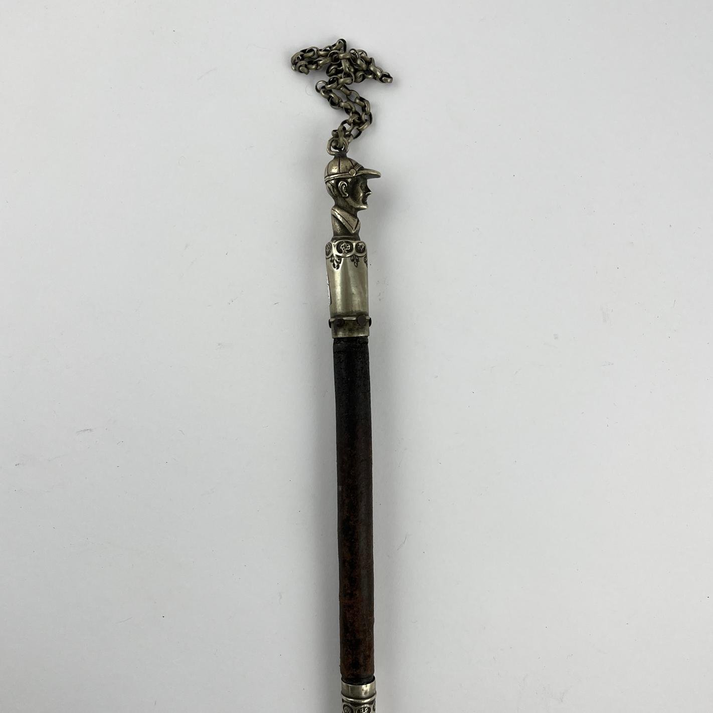 Fusta forrada en cuero, con pasador y cabo en alpaca, y remate de cabo esculturado «busto de jockey».