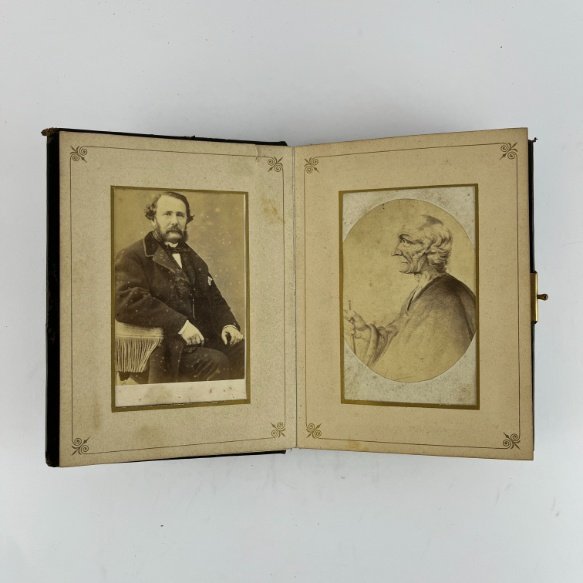 Doce retratos fotográficos en el formato tarjeta de visita o «carte-de-visite». Obras vintage. Copias en papel a la albúmina reunidas en un álbum especial, con su tapas en pleno cuero decoradas con dorados y cartulinas con ventanas de exhibición de 8,8 x 5,4 cm. Ex colección Juan E. Pivel Devoto.