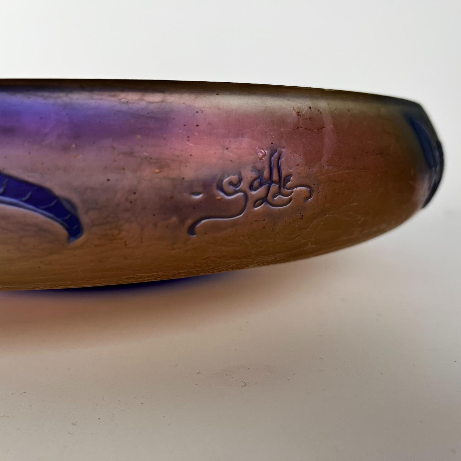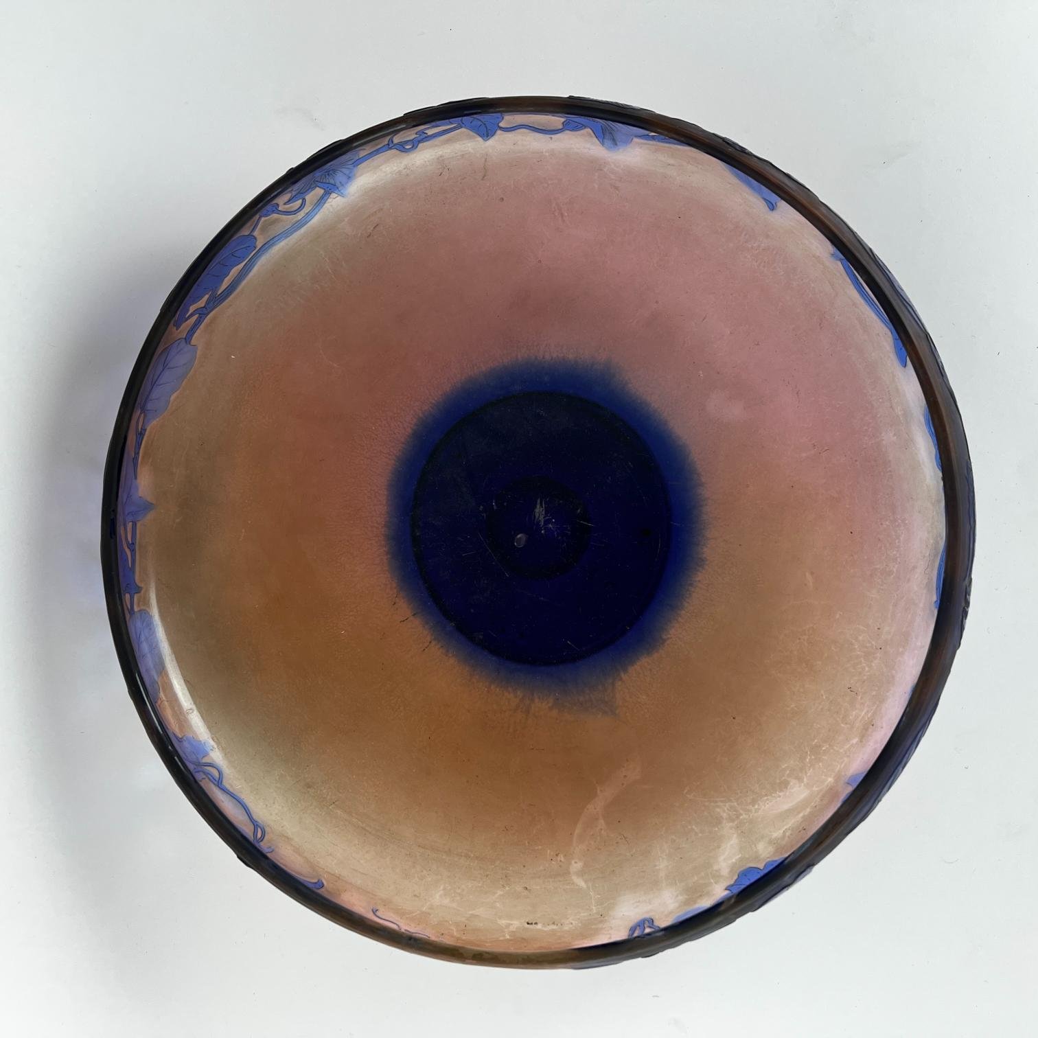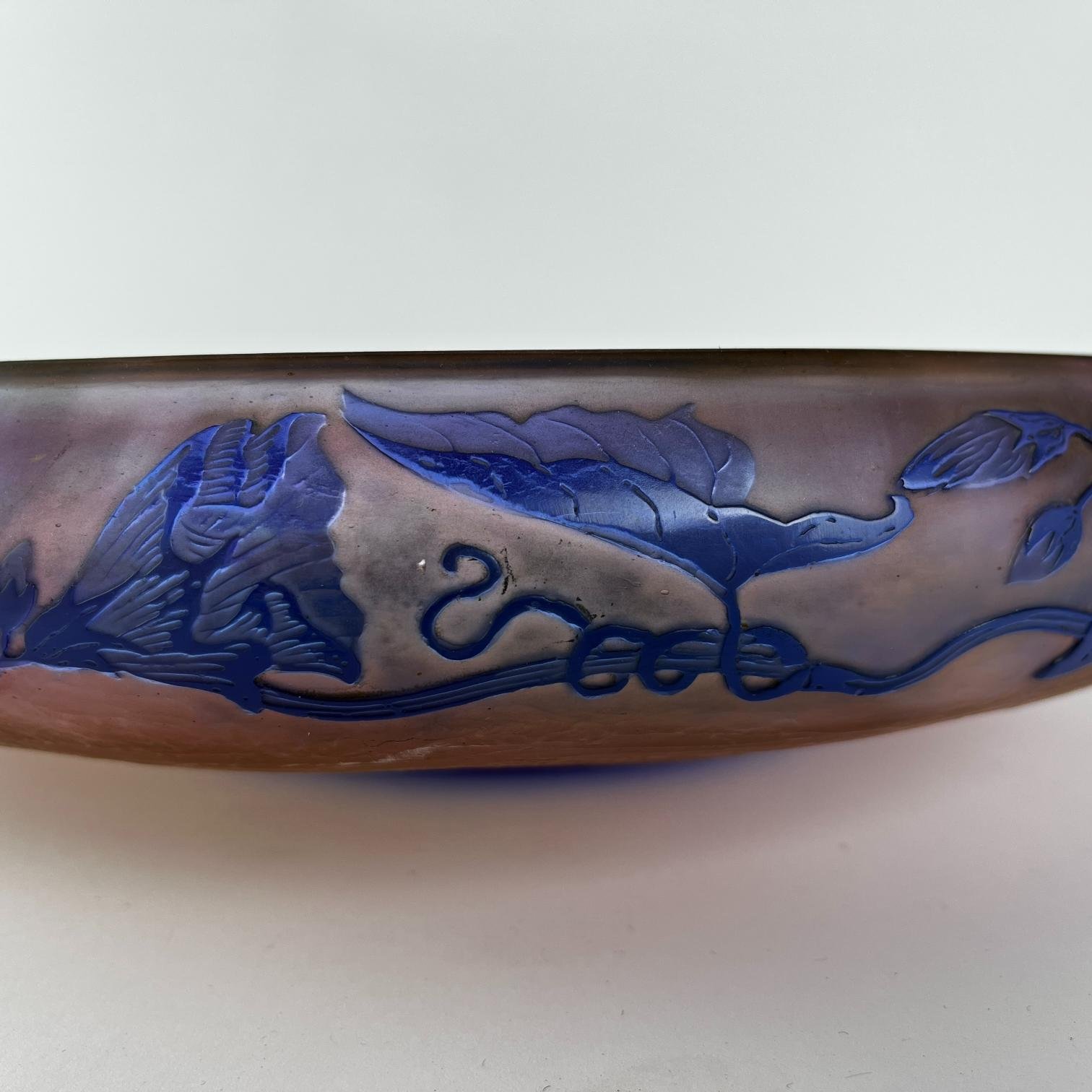 Centro de mesa francés en cristal Gallé tallado al ácido «hojas» en color rosado con relieves en color azul. 7 x 32 cm.
