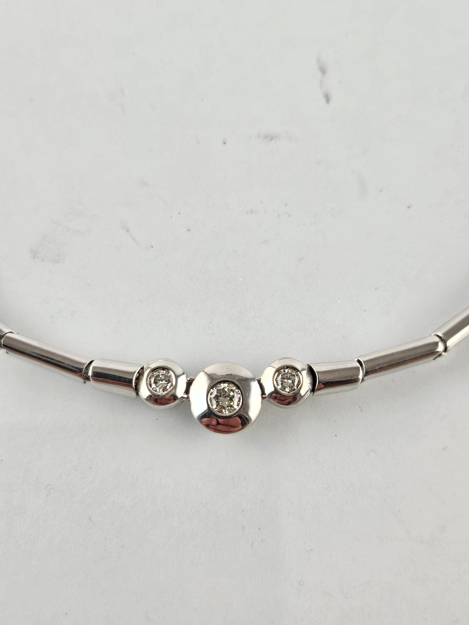 Gargantilla flexible en oro 18 K blanco con tres pequeños brillantes centrales. Largo 440 mm. Peso bruto 25 gr.
