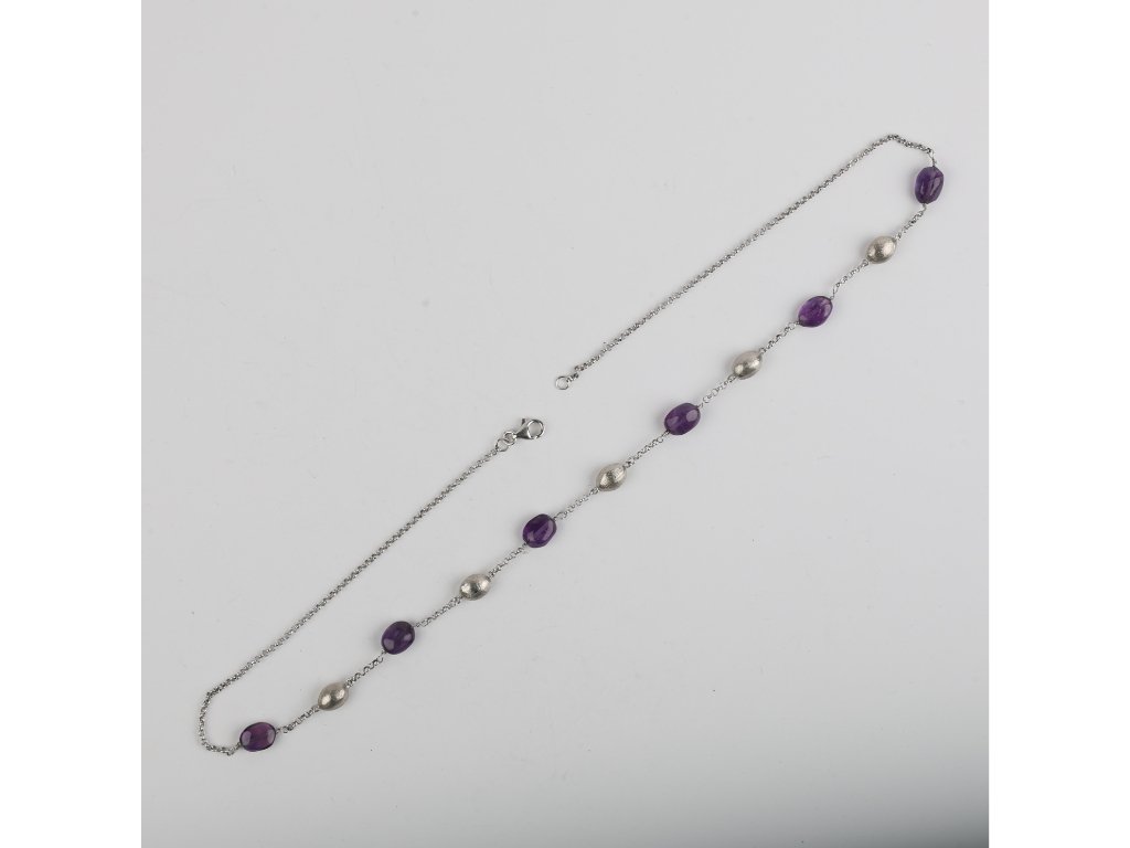 Gargantilla en oro blanco con seis amatistas talla cabullón y cinco cuentas en oro blanco. Largo 48 cm. Peso bruto 12 gr.