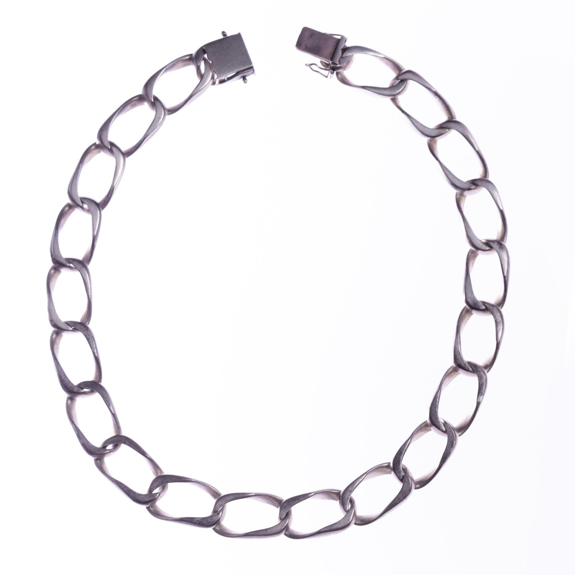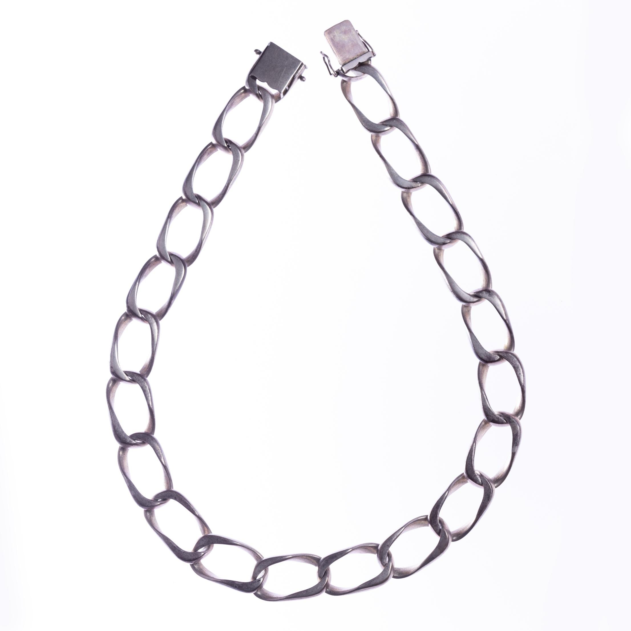 Juego de gargantilla y cadena en plata 900. Largo gargantilla 500 mm. Largo cadena 210 mm. Ancho gargantilla y cadena 17 mm. Peso total 240 gr.