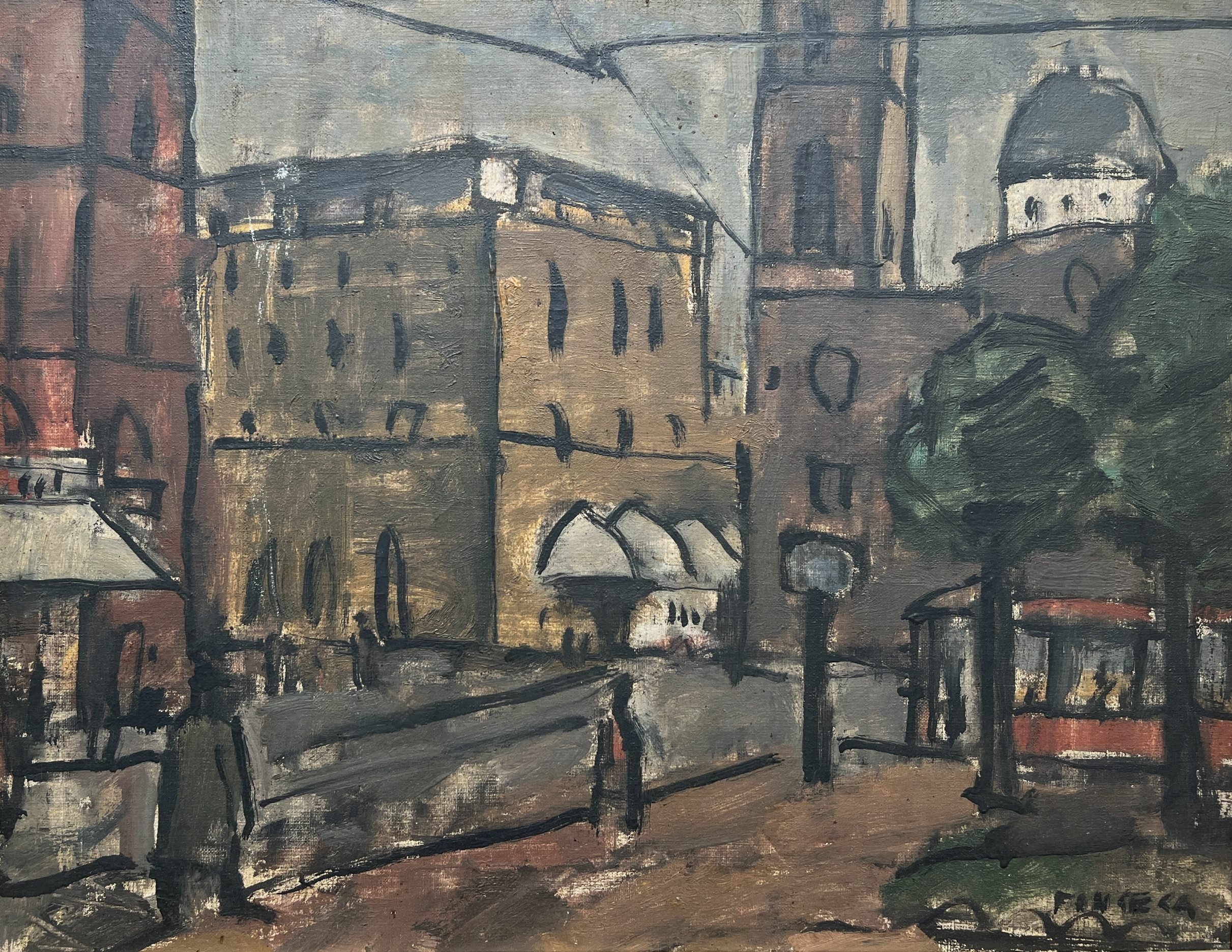 GONZALO FONSECA (Escuela uruguaya, 1922-1997) Óleo sobre tela “Escena de ciudad” firmado abajo a la derecha 36 x 45 cm
