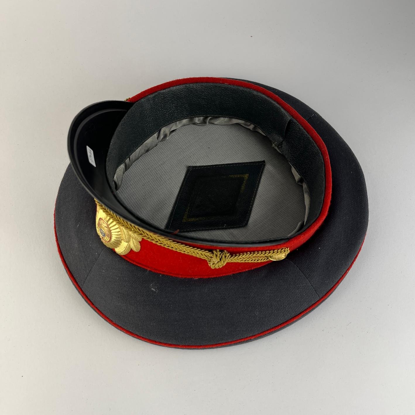 Gorra soviética tipo plato, en paño azul y rojo, con visera en polímero negro, cordona dorada y escudo frontal en bronce y esmalte.