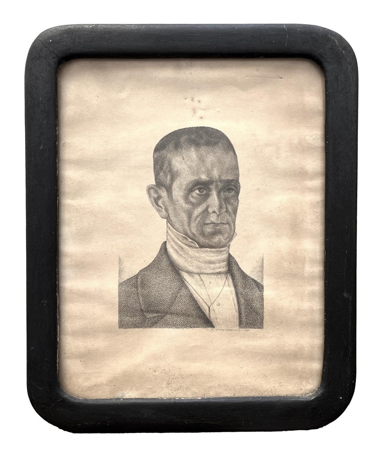 Grabado. «Joaquín Suárez.» 28 x 22 cm. Firmado “J.R. Lanza Mariath” y fechado «1949» abajo a la derecha. Enmarcado.