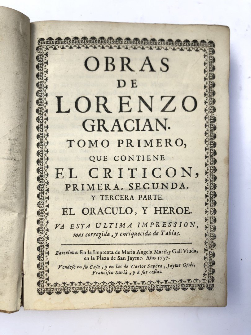 GRACIAN, Lorenzo: El criticon (…), el Oraculo, y Heroe (…). Barcelona, imprenta de María Ángela Martí, y Galí Viuda. 1757. En dos tomos, falta el tomo tres. Ex Biblioteca Juan Carrera Roldán.