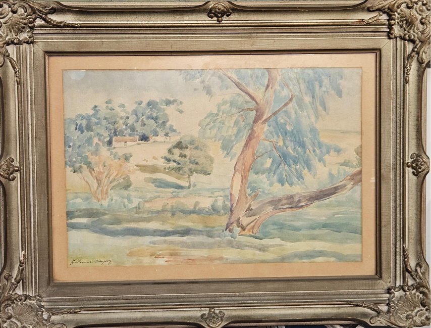 RODRÍGUEZ, Guillermo C. Acuarela sobre papel. «Paisaje de campo.» Firmado abajo a la izquierda. 45 x 29 cm.