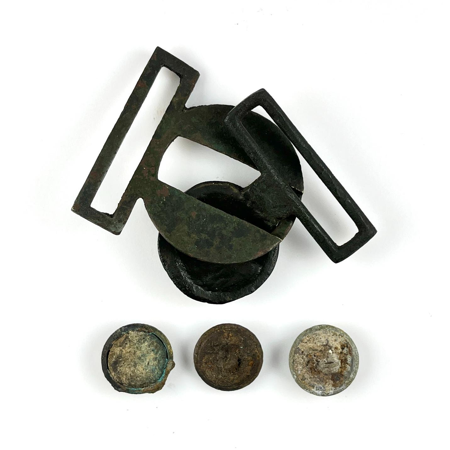 Hebilla de oficial en bronce estampado «Corona Imperial del Brasil» y tres botones de uniforme militar. Período Guerra del Paraguay (1864-1870).