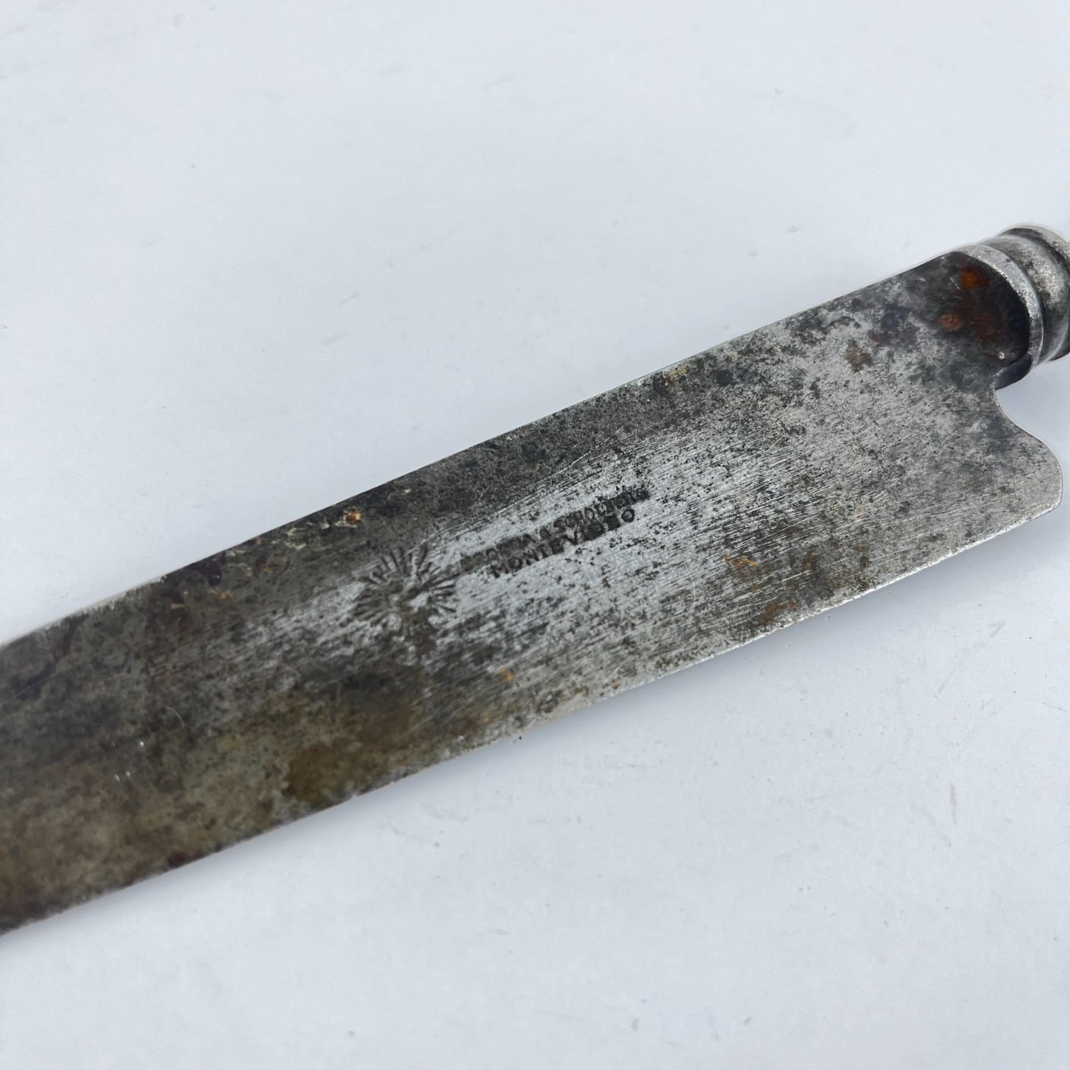Hoja “Sol” de Broqua & Scholberg, Montevideo, para cuchillo criollo, con botón redondo. Largo incluyendo botón 18.5 cm. Alto 3.3 cm.