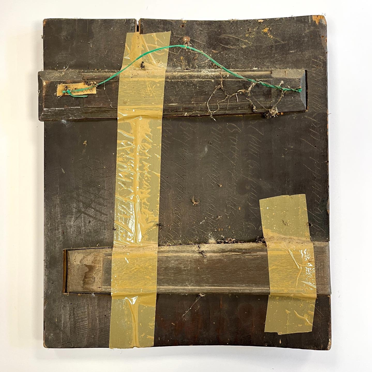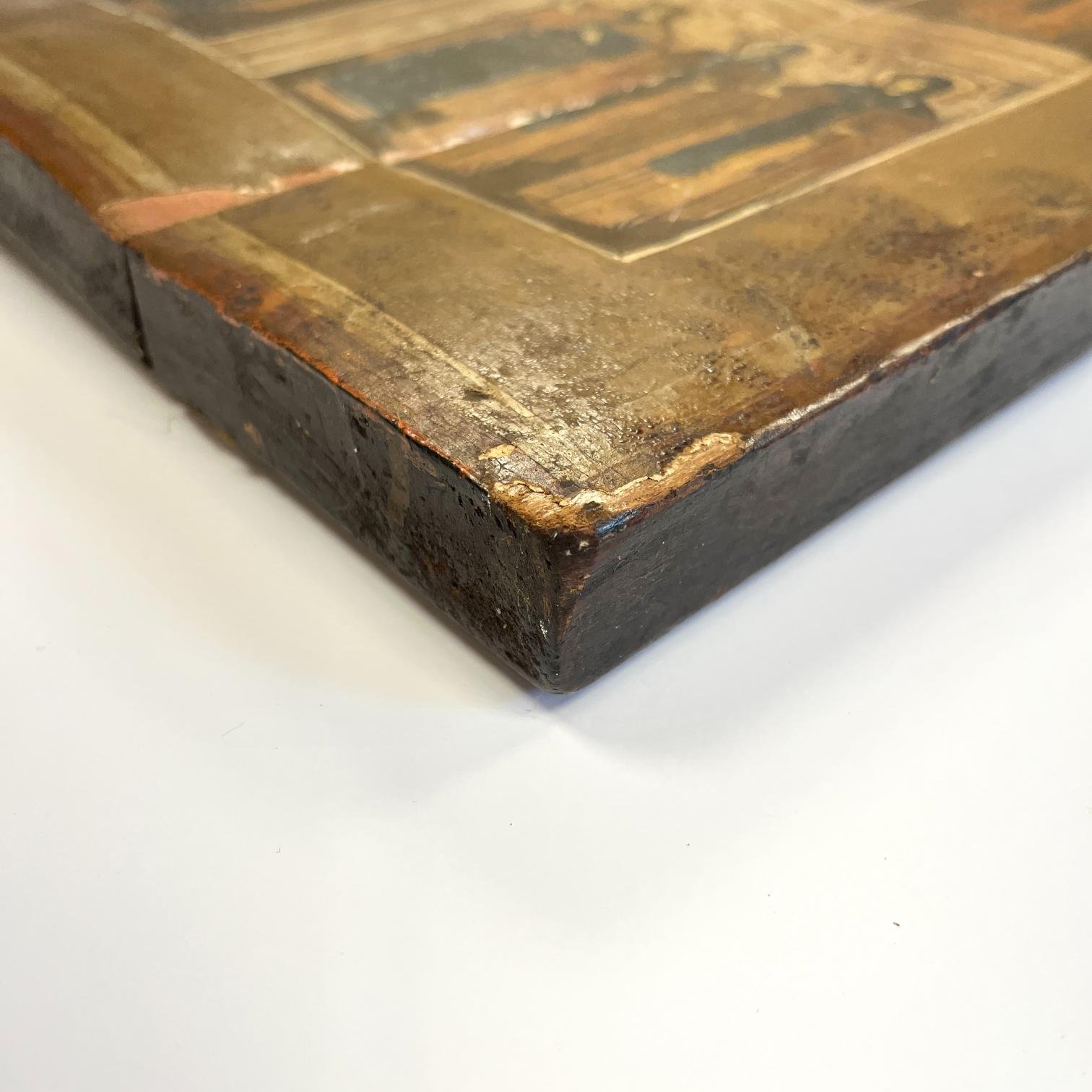 Ícono ortodoxo ruso. Óleo sobre madera. «Santos.» 35,5 x 31 cm. Tabla fisurada