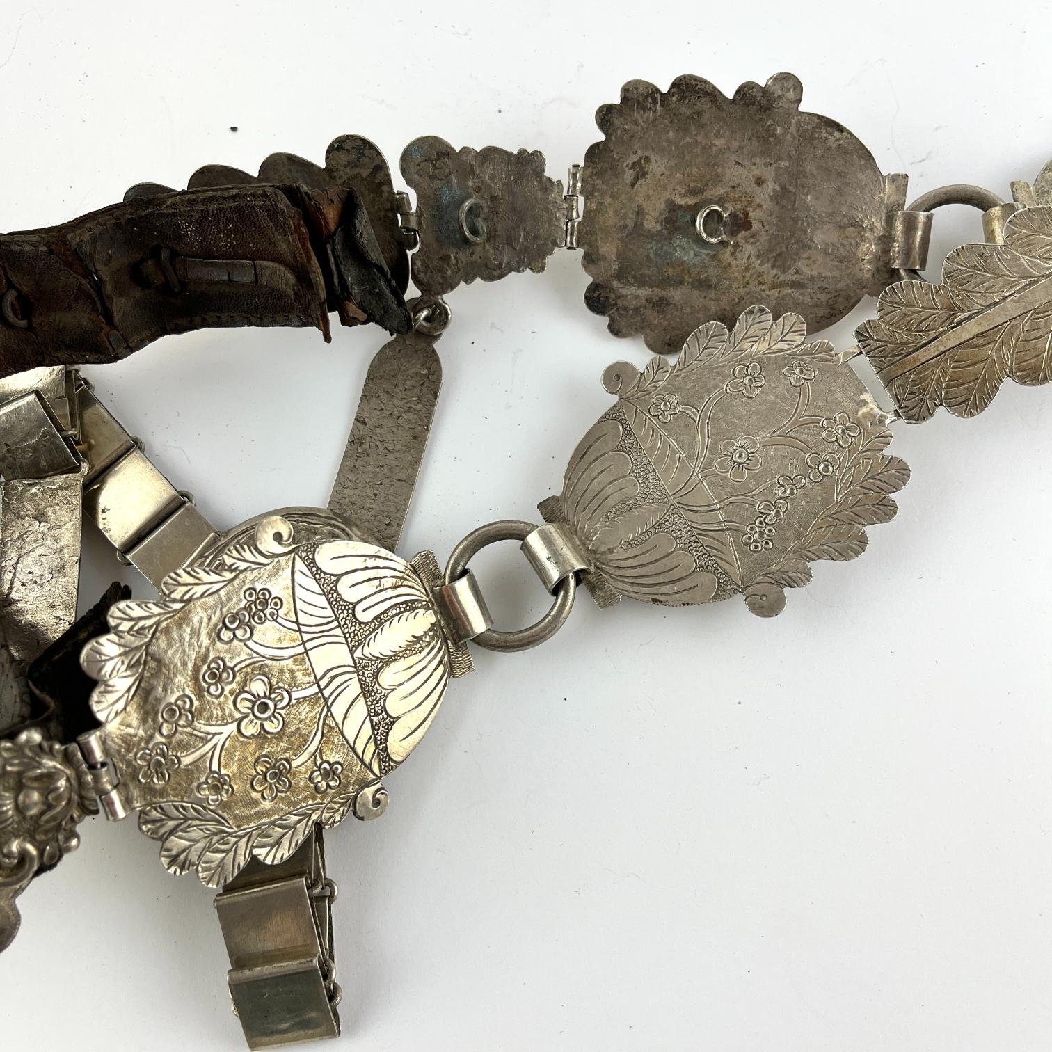 Importante fiador realizado en placas de plata cincelada «hojas y flores», con frontal en eslabones de plata lisa y medallón cincelado «flor». Ca 1900. Pieza que perteneció a Don Nicanor Amaro, propietario de la estancia «El Hervidero» en el departamento de Salto, sitio donde se radicara el campamento artiguista de Purificación en 1815.
