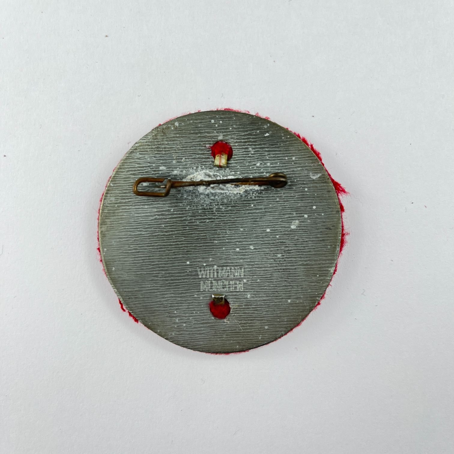 Insignia alemana en aluminio estampado y dorado. «SA-Gruppe Hochland SA-Gruppen Wettkämpfe. 1939.» Presentada sobre paño color rojo. Diámetro 54 mm.