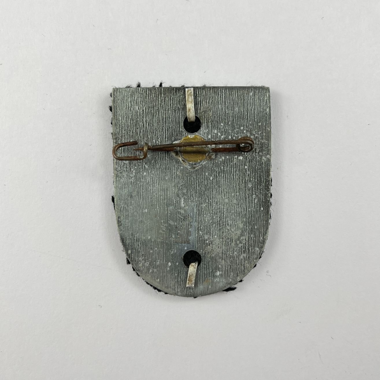 Insignia alemana en aluminio estampado. «Gruppe West Franfurt Main. 10.u.11.VI. 1933. Auf Marsch Abschcnitt XI.» Presentada sobre paño color negro. 52 x 40 mm.