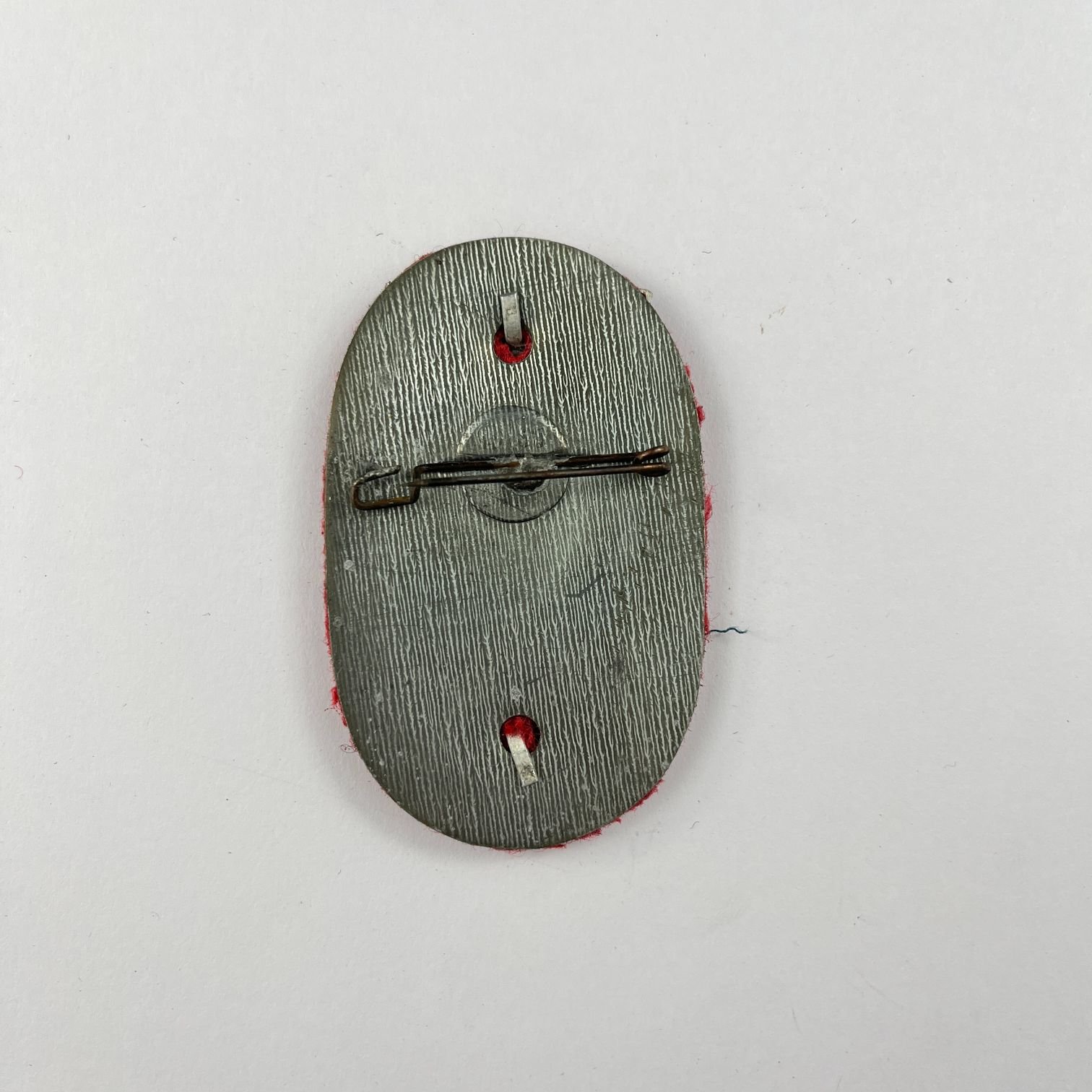 Insignia alemana en aluminio estampado. «KdF-Wagen. Gautag. Ost-Hannover. 1939.» Presentada sobre paño color rojo. 71 x 44 mm.