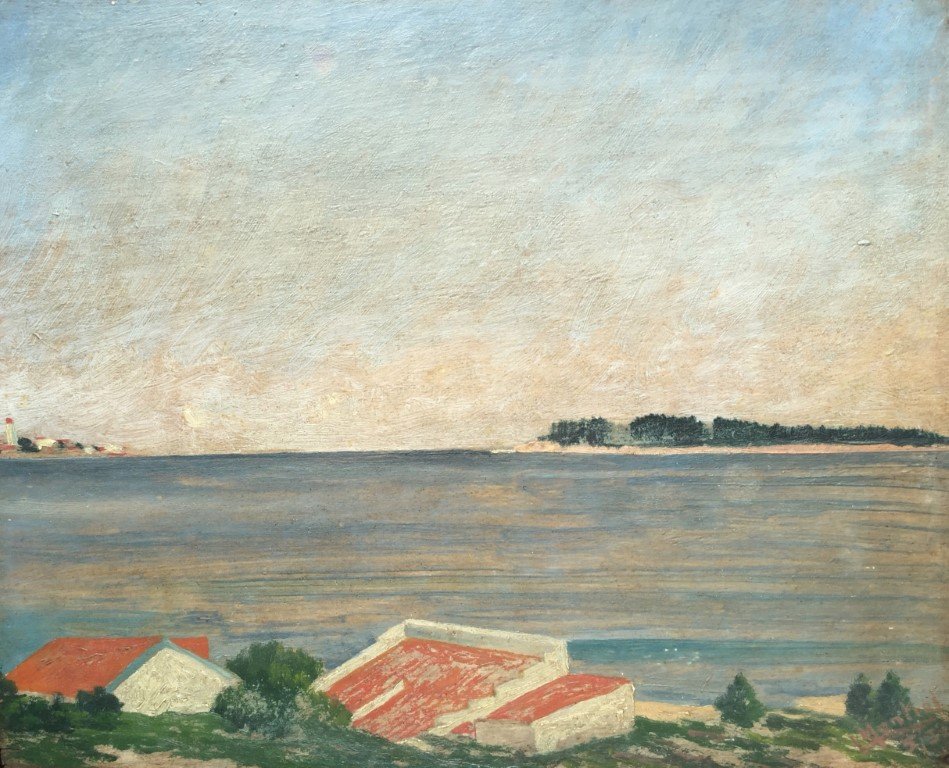 MONTIEL, J. Óleo sobre tabla. «Vista de Punta del Este desde la Playa Mansa.» Firmado y fechado «1936» abajo a la derecha. 36 x 46 cm.