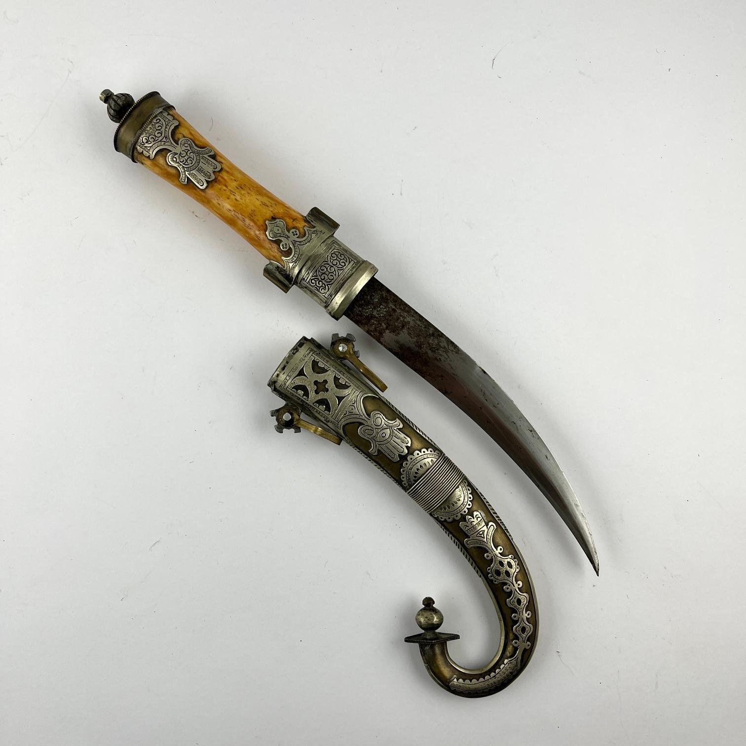 Jambiya. Hoja con punzones no identificados. Cabo y vaina en bronce y alpaca cincelada, con empuñadura en hueso liso. Largo total 37 cm.