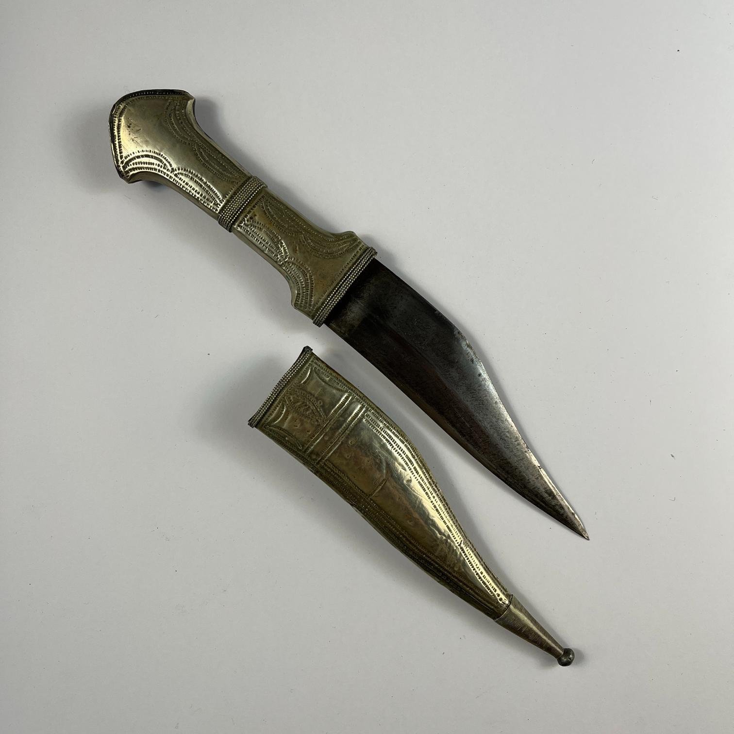 Jambiya marroquí. Cabo y vaina en plata repujada, con dorso en hojalata y torzal en alambre plateado. Largo 24 cm.