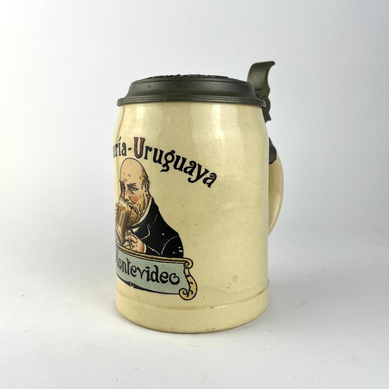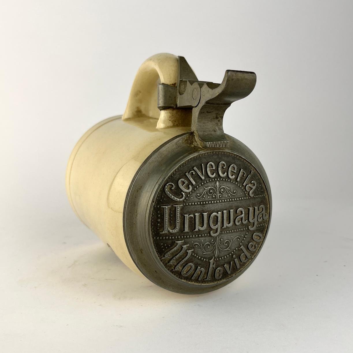 Jarra de cerveza en gres, perteneciente a la Cervecería Uruguaya de Montevideo, con tapa en peltre.