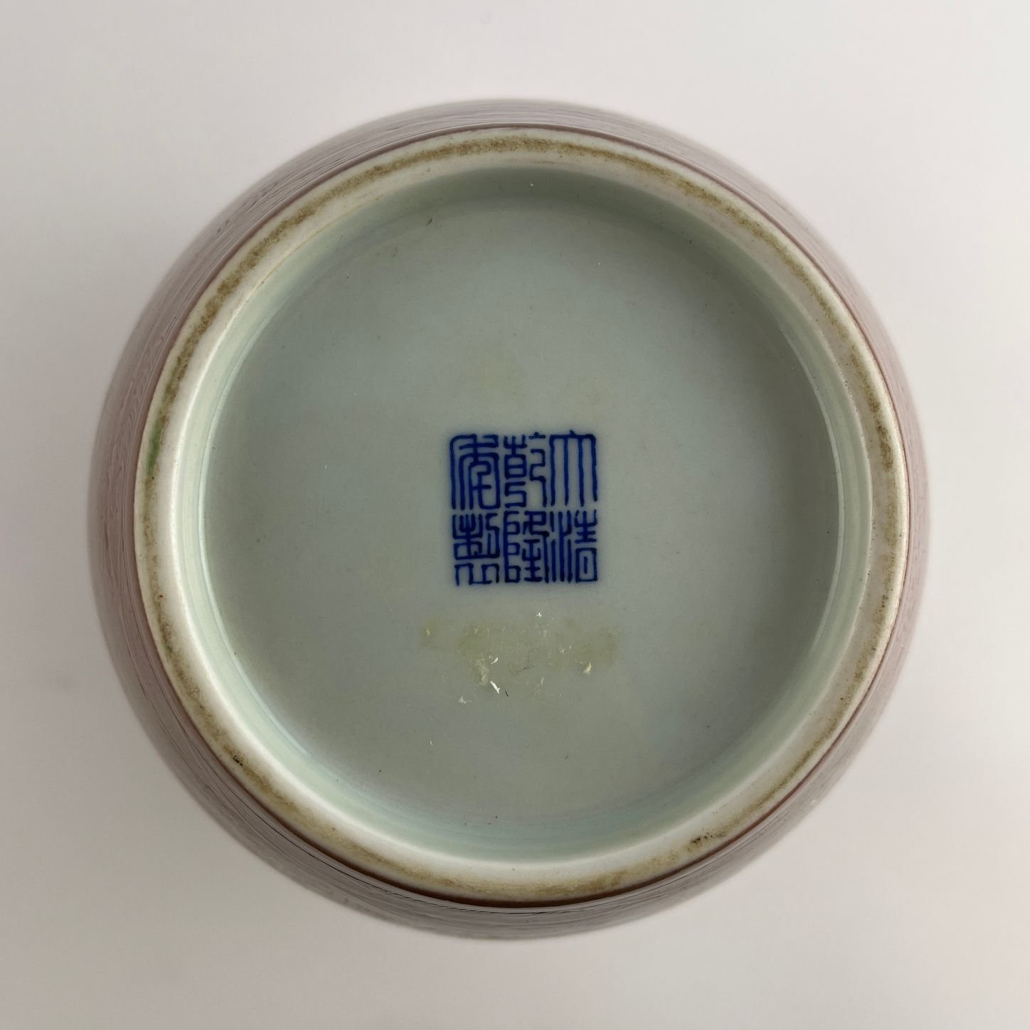 Jarrón chino en porcelana vidriada color berenjena con decoración incisa «dragones persiguiendo la perla» y «oleaje», con borde decorado «guarda ruyi» y «hojas de banano». Interior y base vidriados en tono celeste. Base con sello del emperador Qianlong. 19 x 15 cm.