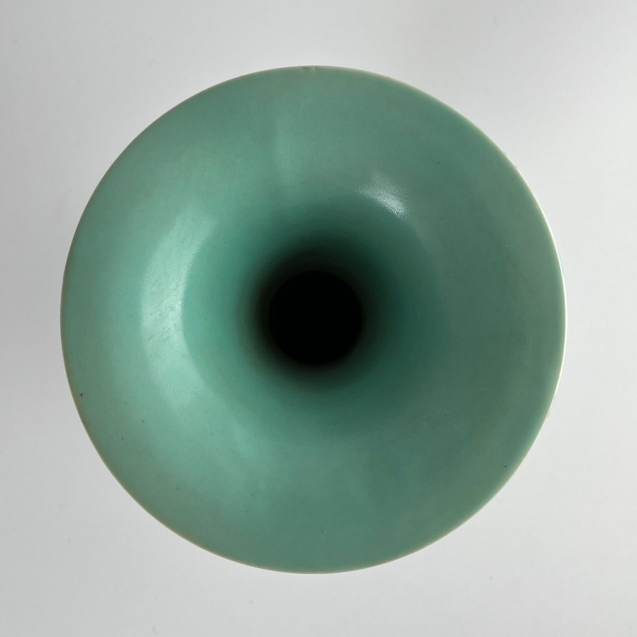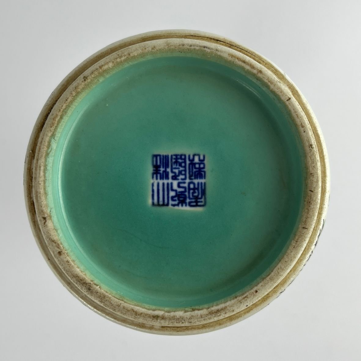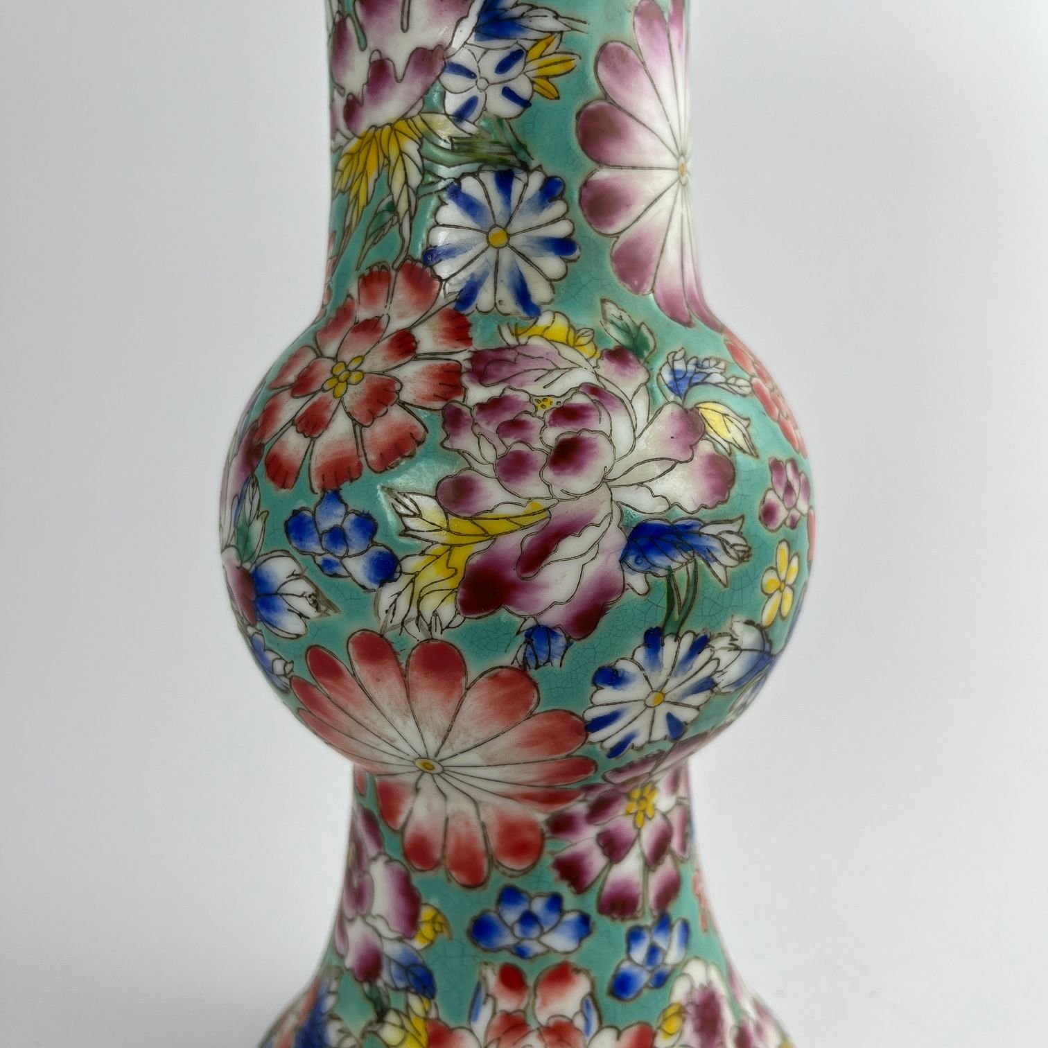 Jarrón chino en porcelana estilo millefiori con interior en color turquesa. Marca del período en la base. 26.5 x 15 cm.