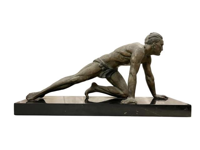 JEAN DE RONCOURT (Escuela francesa, 1869-1937) Escultura art decó en metal, con peana en ónix «Atleta» Ca. 1925 Firmada en la peana 30 x 60 x 17 cm