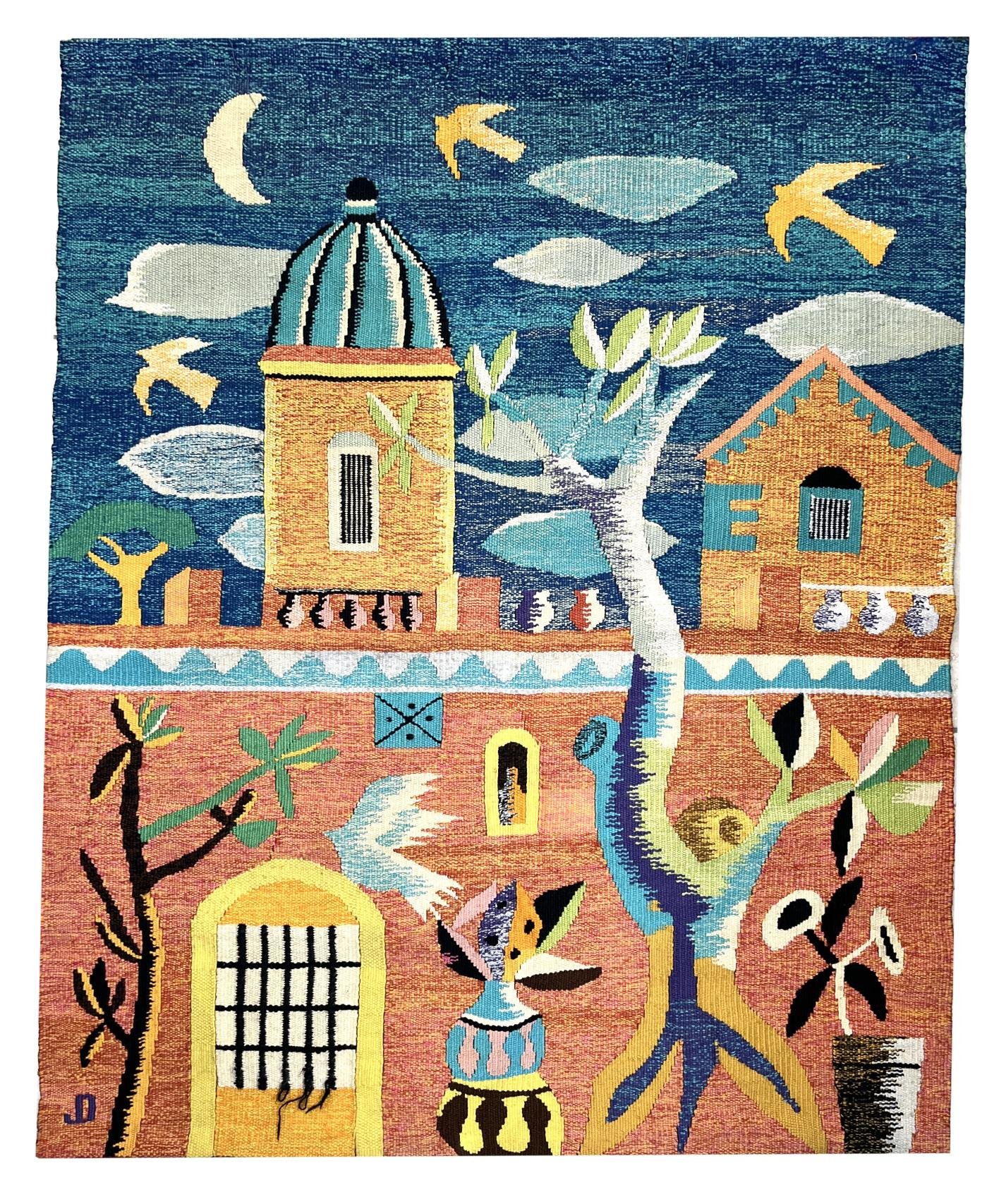 JORGE DAMIANI (Escuela uruguaya, 1931-2017) Tapiz en lana «Paisaje con ave y casas» Año 1974 Firmado con iniciales «JD» abajo a la izquierda 135 x 110