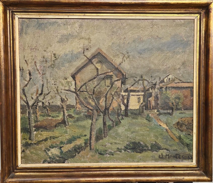 MONTES, José «Pepe» (escuela uruguaya, 1929-1997). Óleo sobre tela. «Caserío.» Firmado y fechado «52» abajo a la derecha.