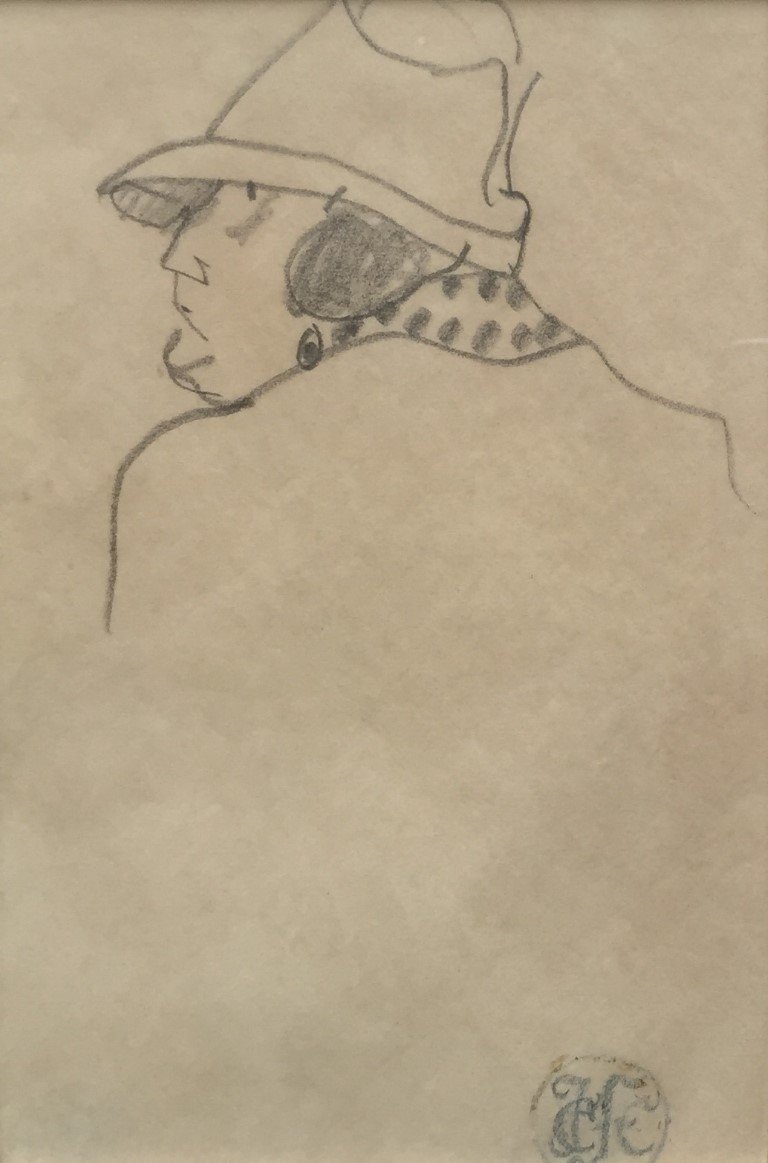 FIGARI, Juan Carlos (escuela uruguaya, 1893-1927). Lápiz sobre papel. «Señora con sombrero.» Firmado con sello del artista abajo a la derecha. 18 x 12 cm.