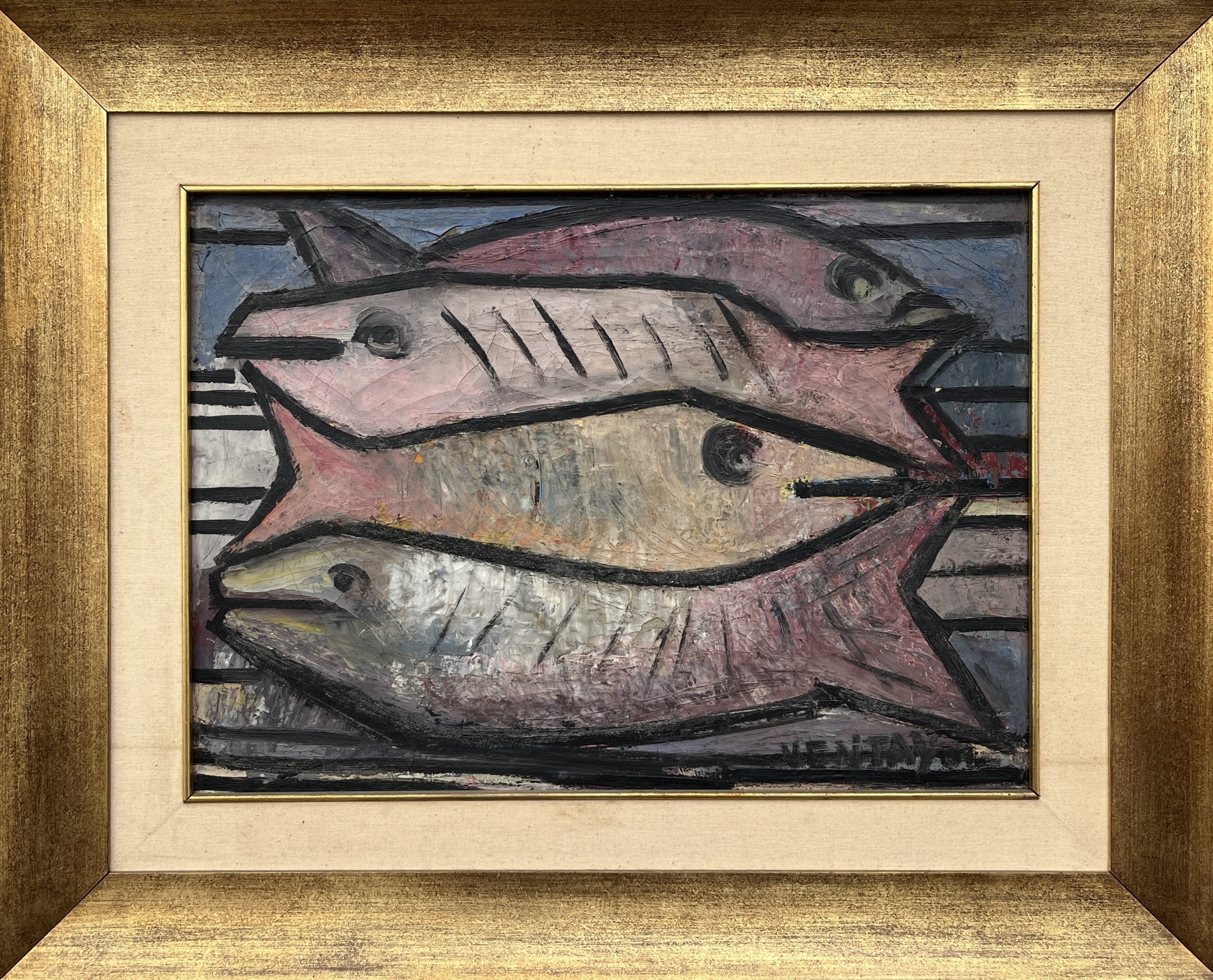 JUAN VENTAYOL (Escuela uruguaya, 1915-1971) Óleo sobre tela «Peces» Firmado abajo a la derecha 39 x 54 cm Presenta craquelado en óleo