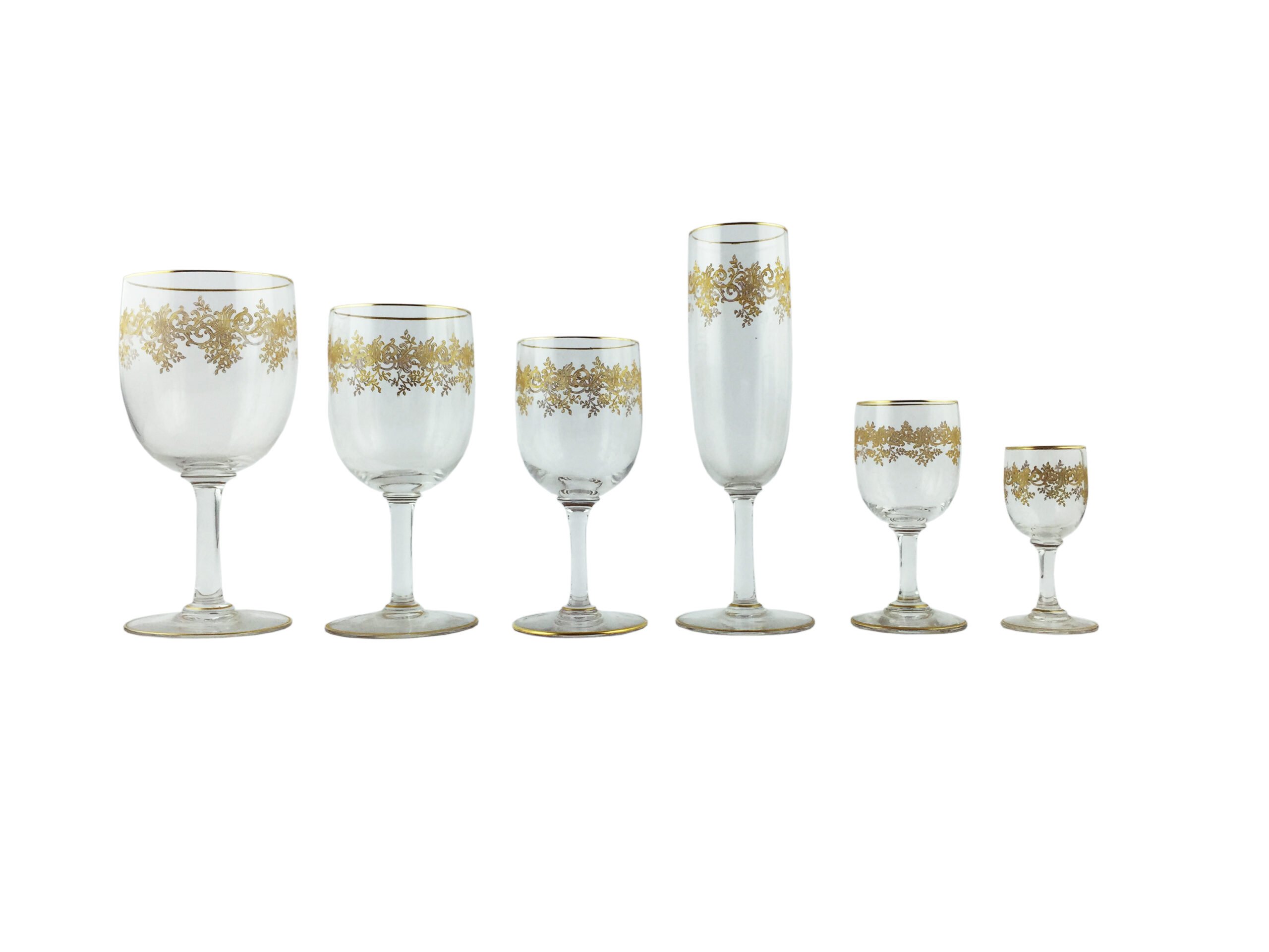 Juego de copas en cristal Baccarat, modelo Recamier. Compuesto por: 12 copas para agua 12 copas para vino tinto 12 copas para vino blanco 12 para champagne tipo flute 12 copas para jerez 12 copas para licor 2 jarras para agua 1 bombonera con tapa 1 plato de 19 cm de diámetro 1 botellón sin tapón Total 77 piezas