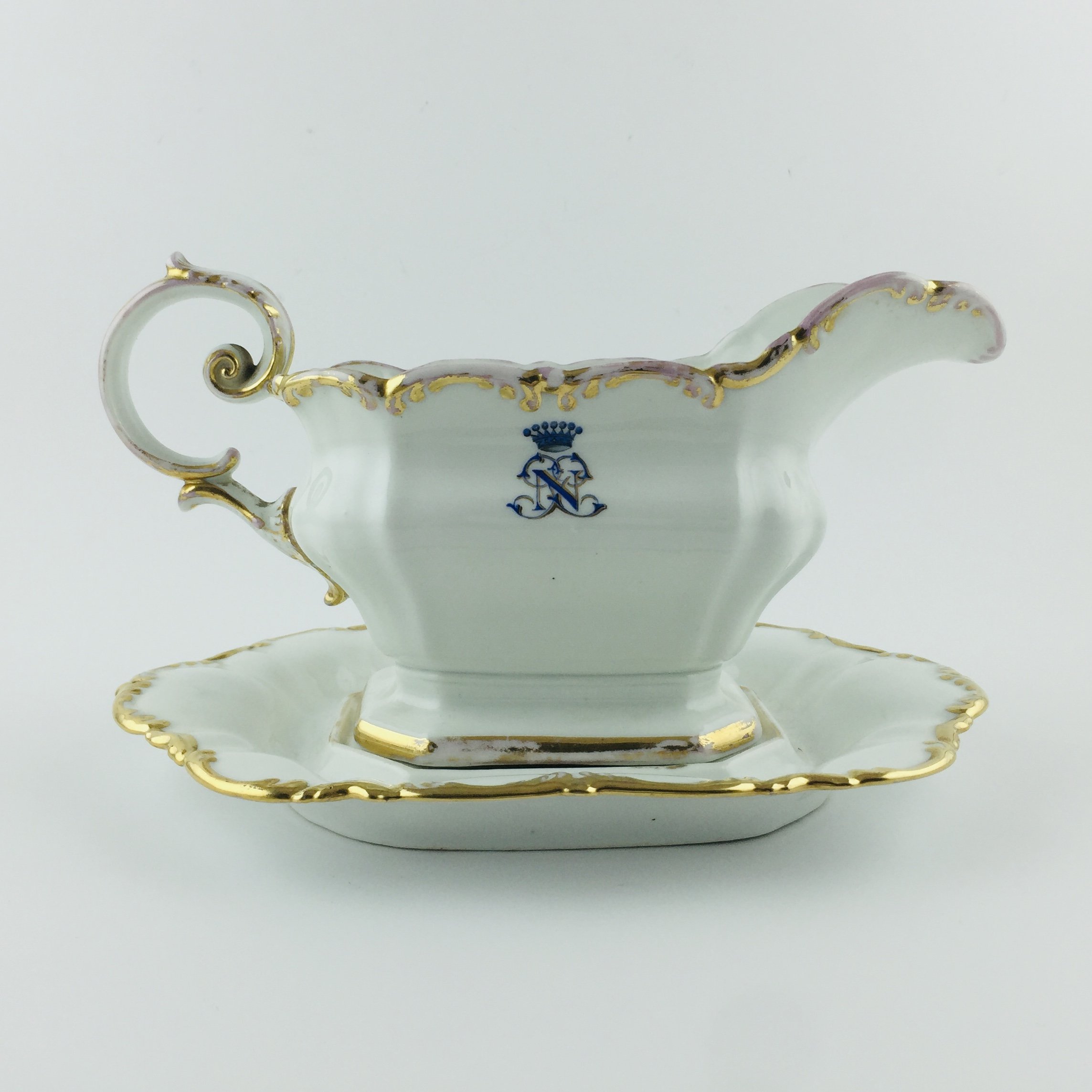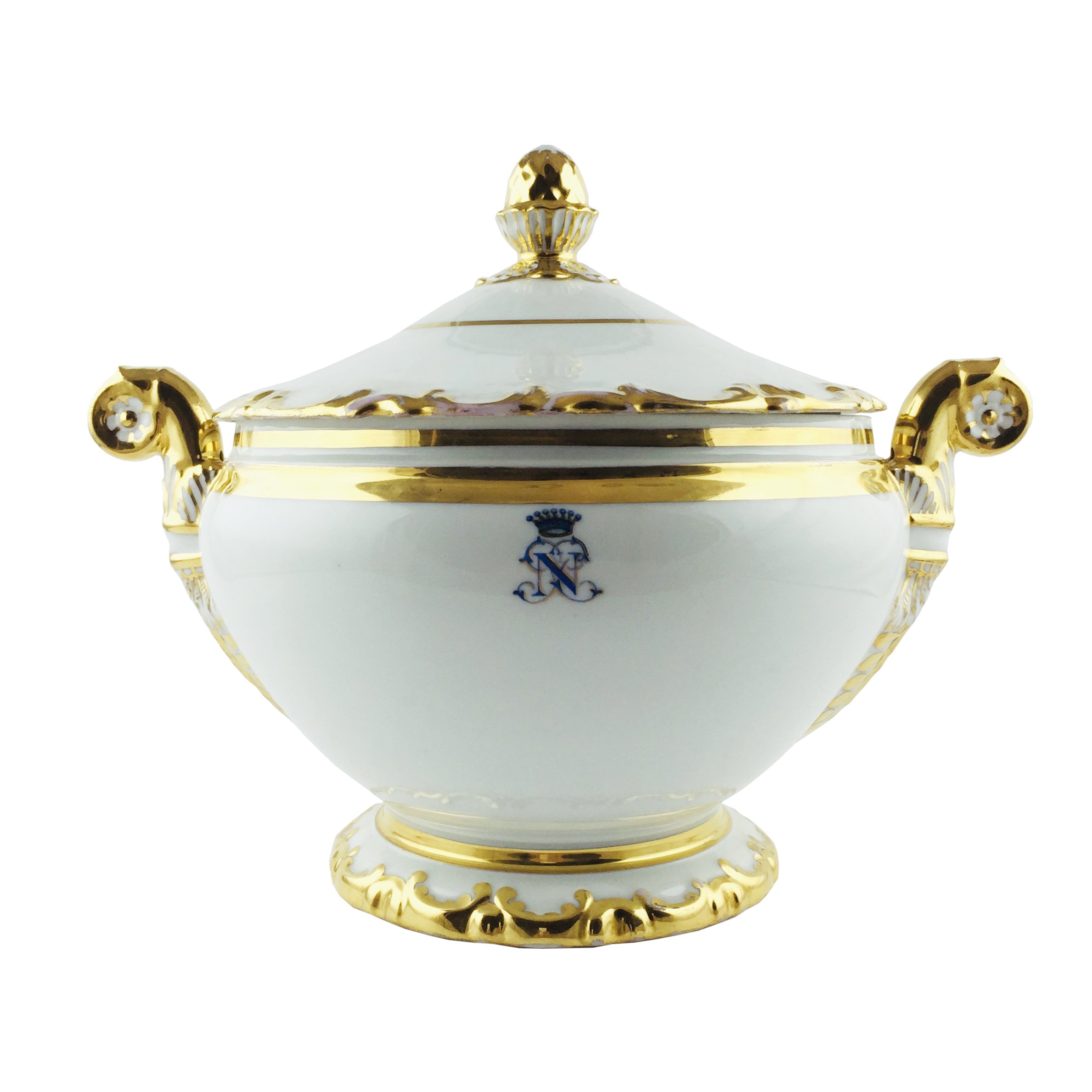 Gran juego de mesa en porcelana europea blanca con borde dorado en ondas y monograma «N coronada». Compuesto por: