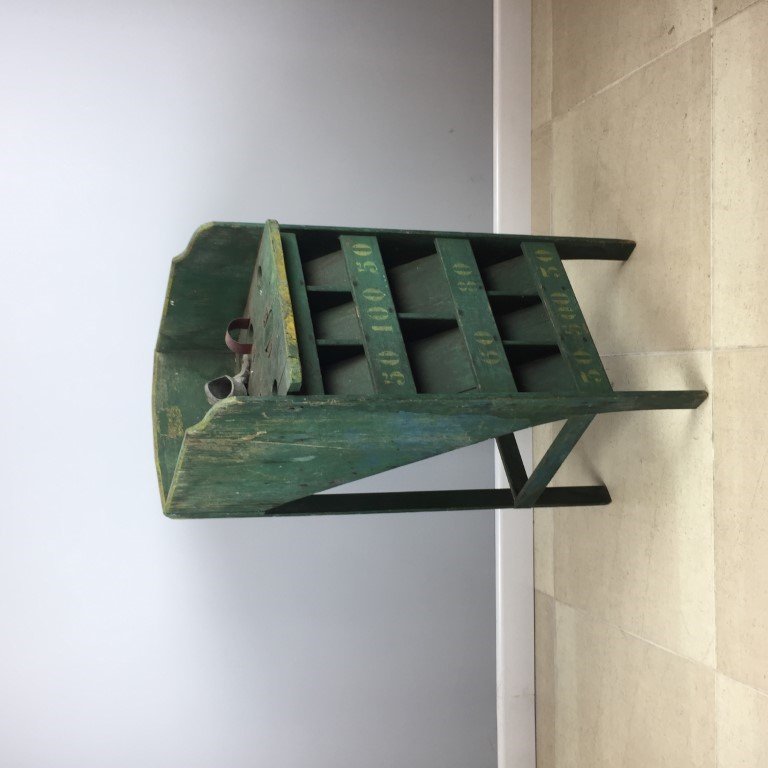 Juego del sapo en madera pintada color verde, con sapo en metal. 75 x 31 x 33 cm.