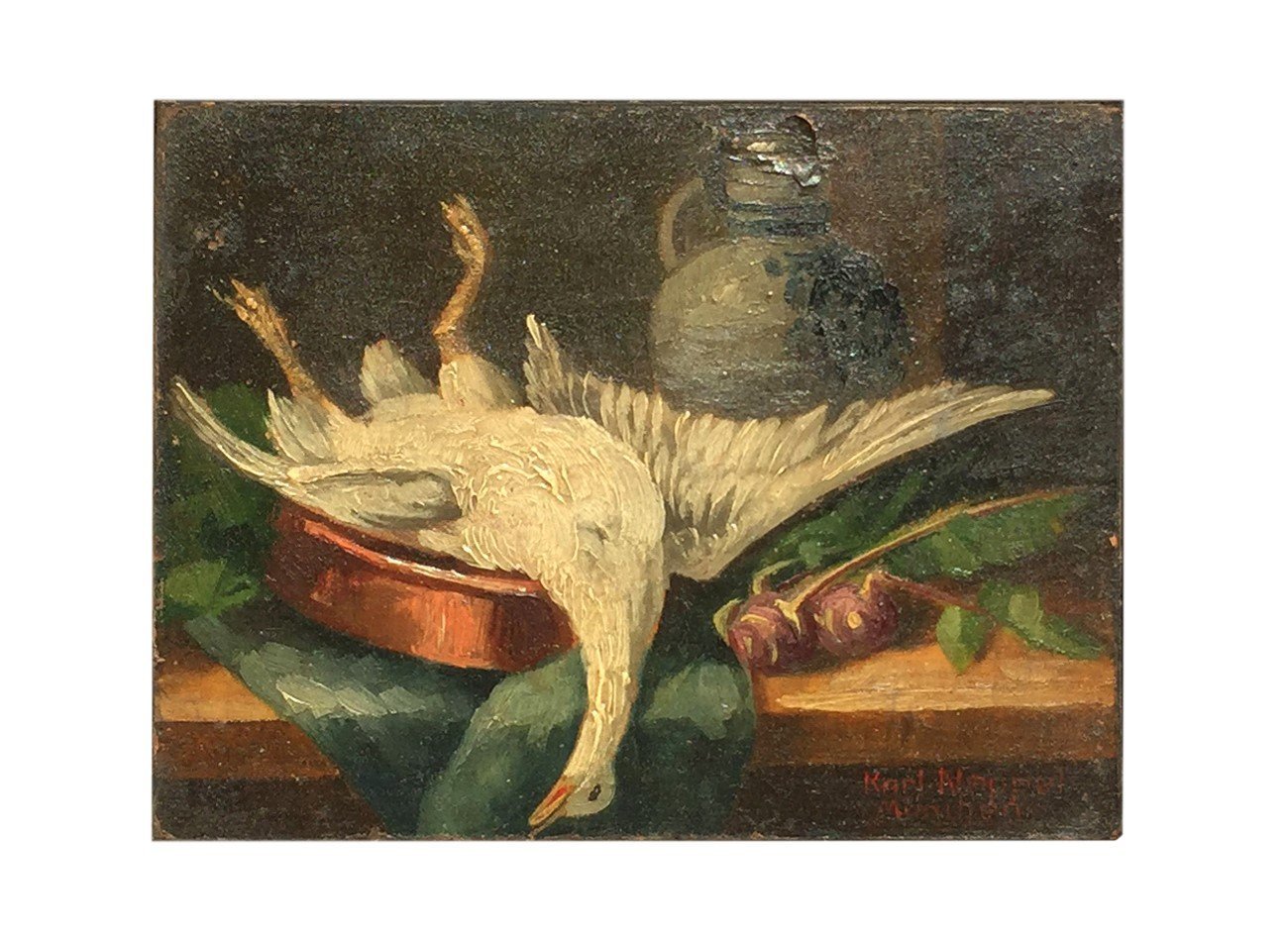 NEPPEL, Karl (escuela alemana 1883-1961). Par de óleos sobre tabla. “Naturaleza muerta con cerezas» y “Naturaleza muerta con cisne.” Firmado abajo a la derecha. 9 x 12 cm.