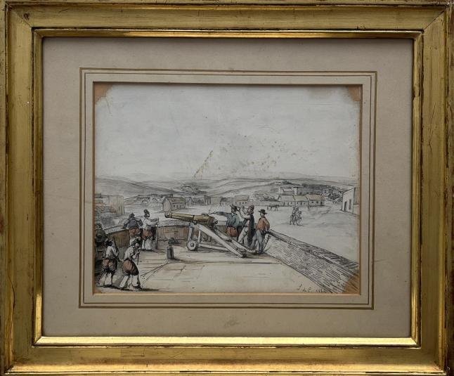 Precioso testimonio iconográfico. Acuarela y grafito sobre papel, firmada con las iniciales “L. de C.”, abajo a la derecha. Medidas: 21 x 26 cm. Obra con huellas de humedad y una restauración marginal. Enmarcada.
