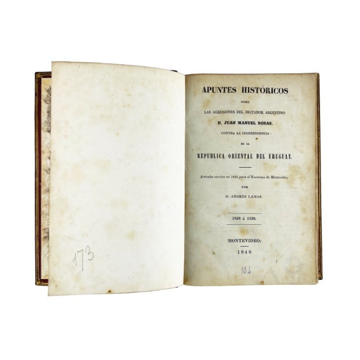 “Apuntes históricos sobre las agresiones del dictador argentino D. Juan Manuel de Rosas contra la Independencia de la República Oriental del Uruguay. Artículos escritos en 1845 para el Nacional de Montevideo, por […]” 1828 á 1838. Montevideo; 1849.