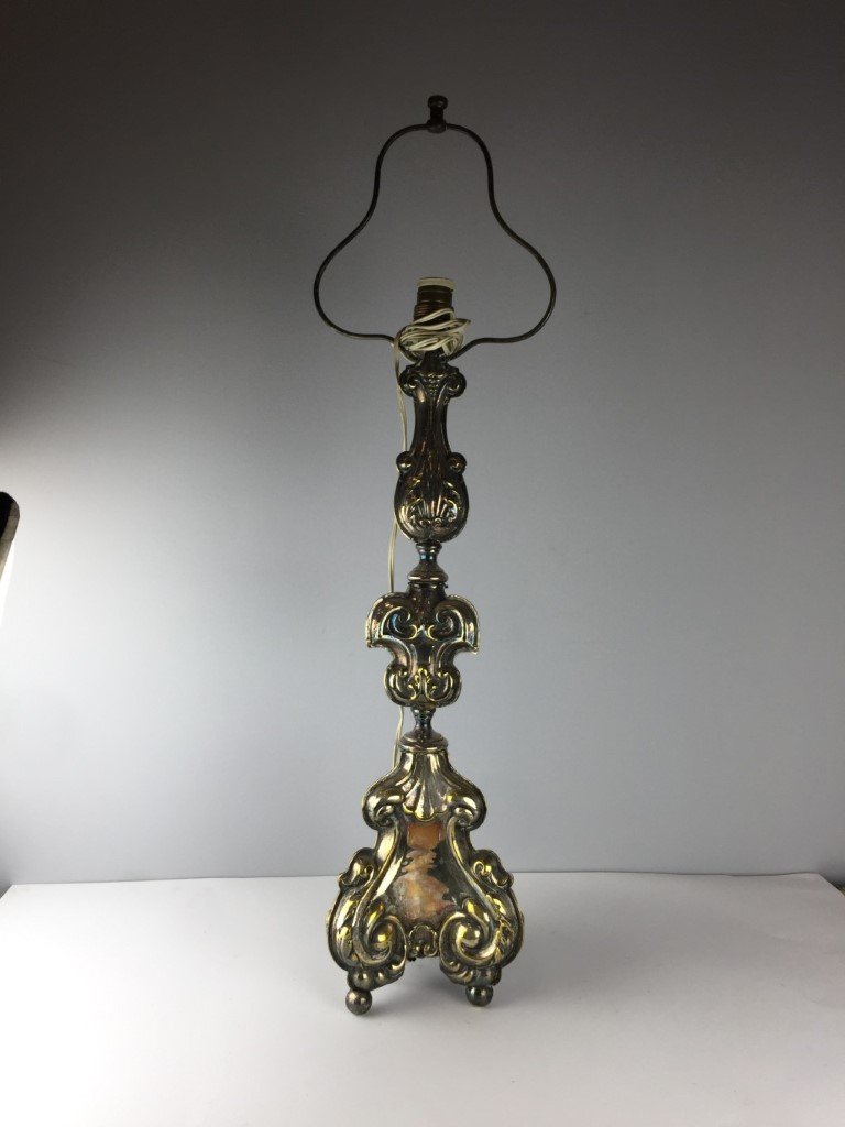 Lámpara de sobremesa en bronce plateado y repujado «hojas». Alto 83 cm.