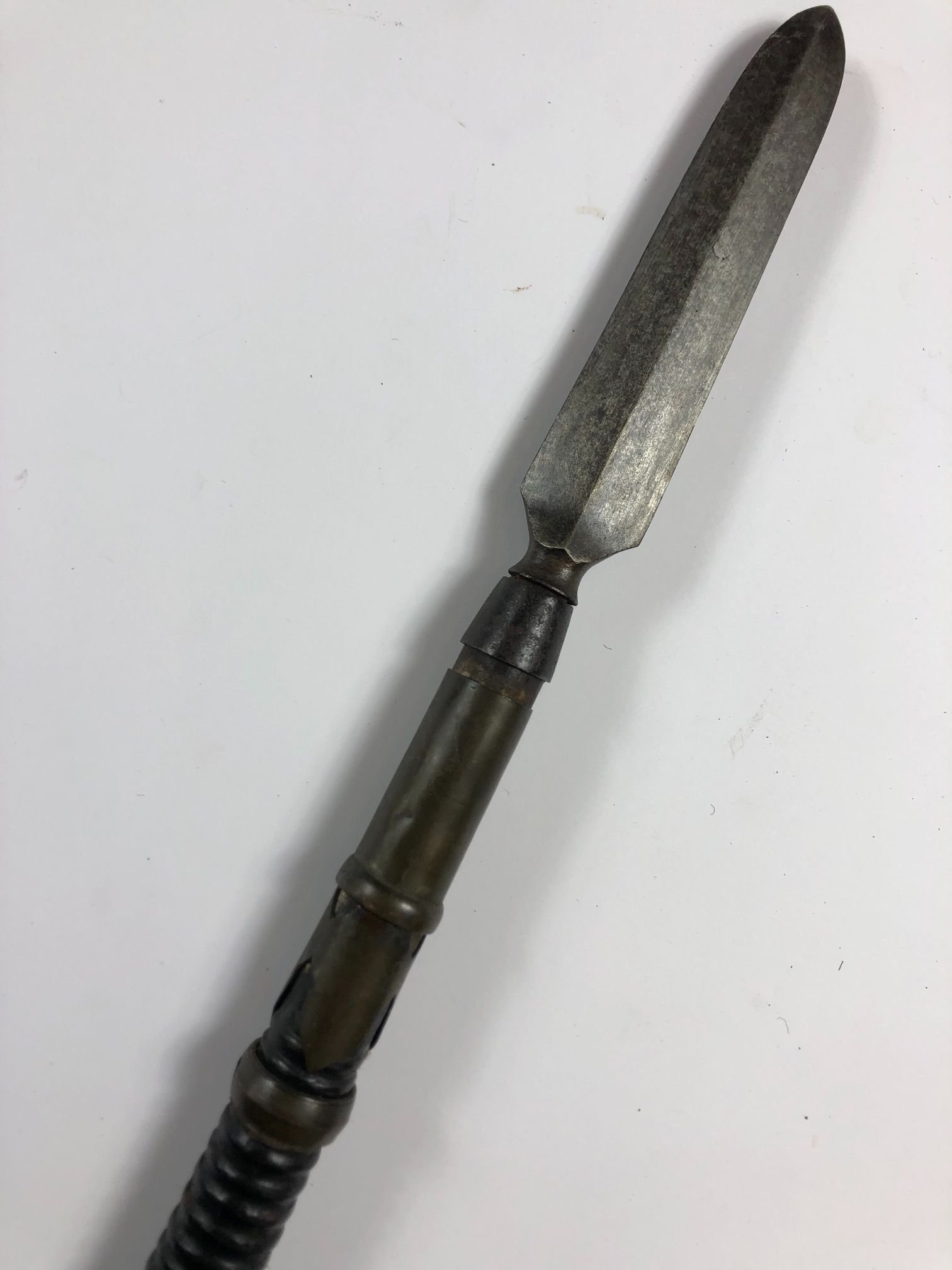 Lanza japonesa tipo yari, período Edo. Hoja en hierro forjado, de cuatro caras. Asta en madera, pasadores en bronce. Grip laqueado y regatón en hierro forjado. Alto 190 cm.