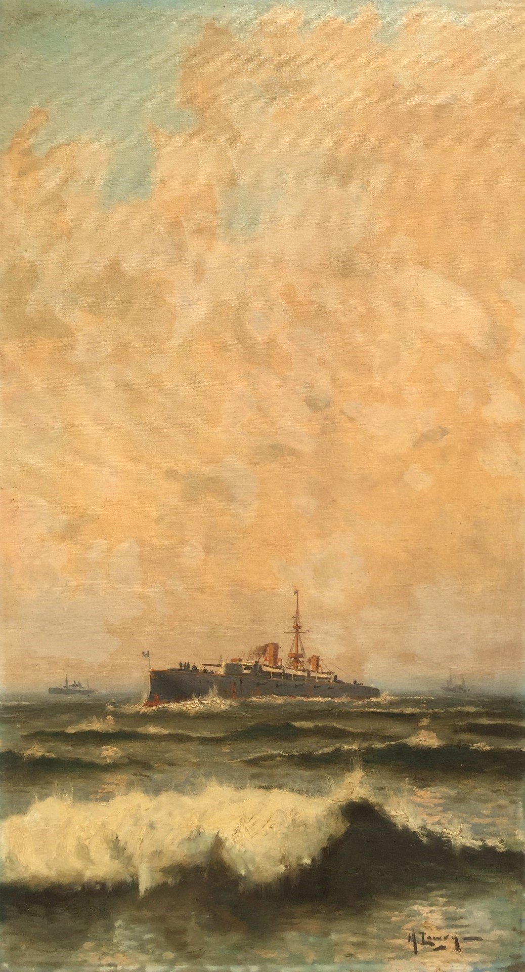 LARRAVIDE, Manuel (escuela uruguaya, 1831-1910). Óleo sobre tela. «Crucero acorazado argentino clase San Martín.» Firmado abajo a la derecha. 87.5 x 49.