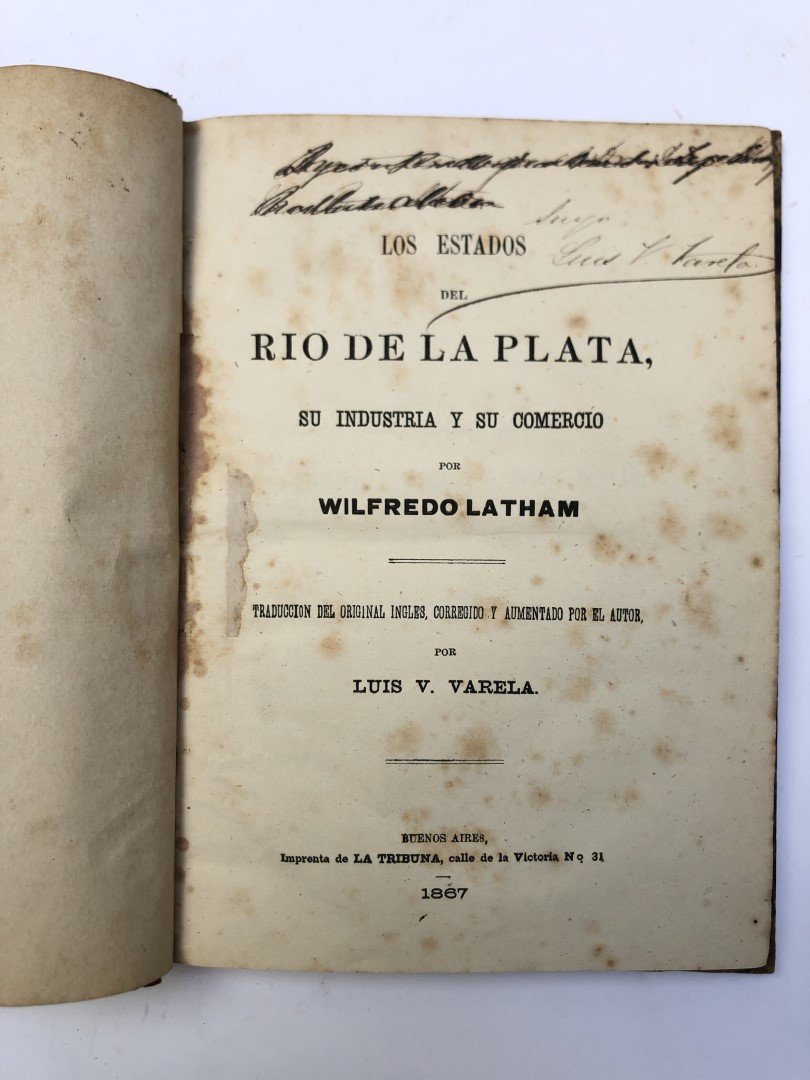 LATHAM, Wilfredo: Los Estados del Río de La Plata su industria y su comercio. Buenos Aires, imprenta de La Tribuna. 1867. Encuadernación con lomo de cuero.