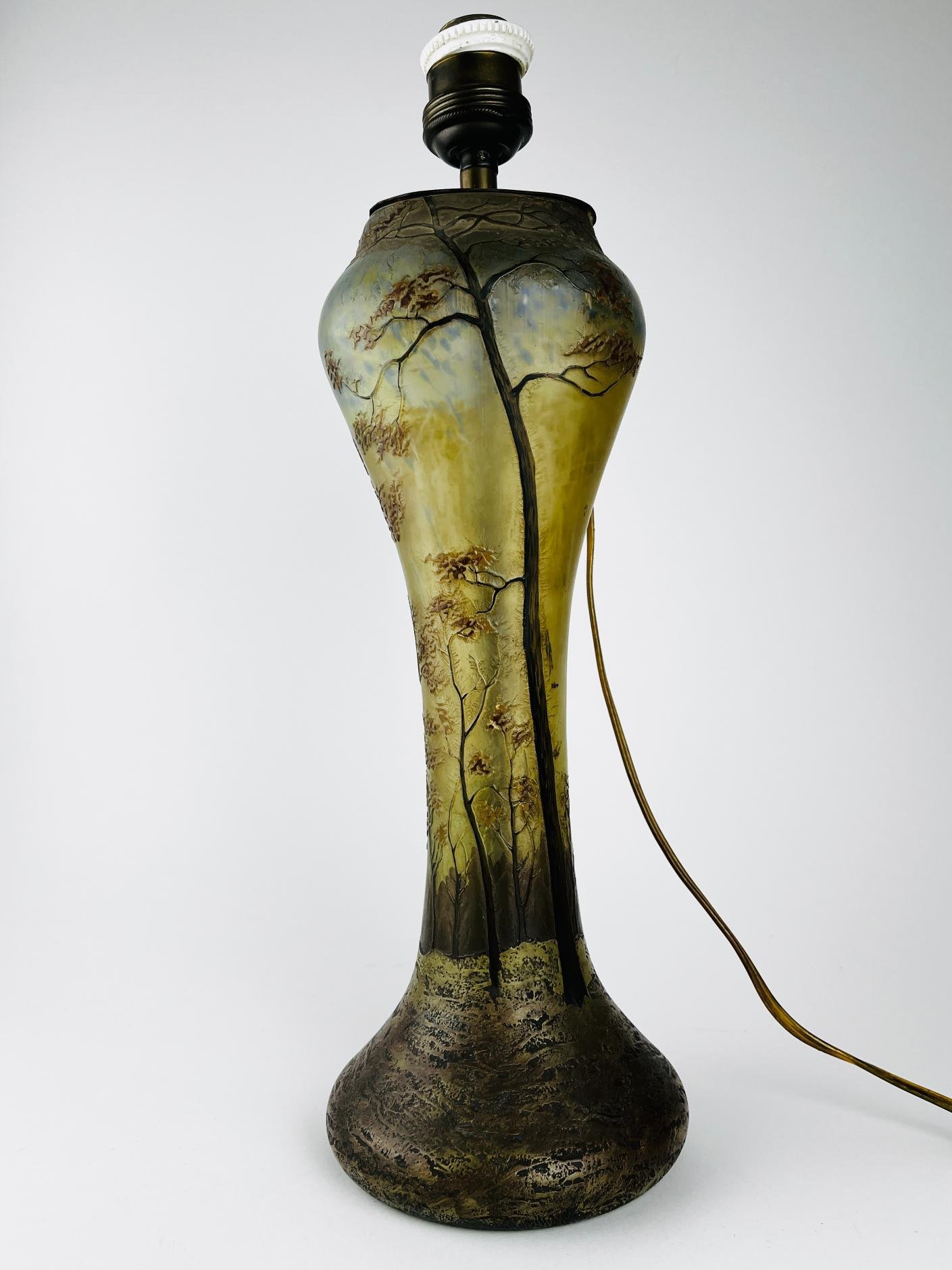 Florero francés en cristal Legras tallado al ácido «bosques» en color verde y celeste 30 x 11 cm. Electrificado, sin perforar.