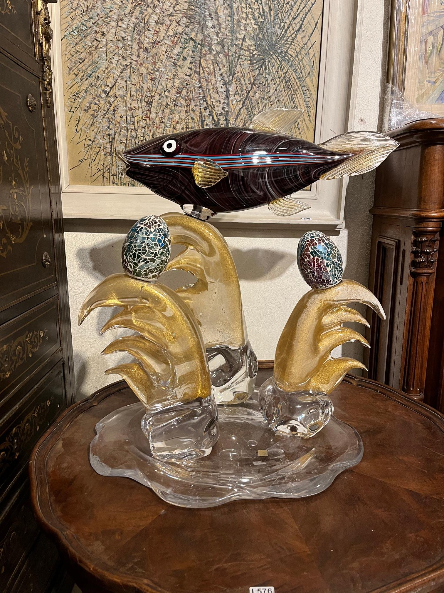 LICIO ZANETTI (escuela italiana, 1915-?). Escultura en cristal de Murano, policromada y decorada con lámina de oro. «Fondo marino.» Pez desmontable. 55 x 55 x 40 cm. Presenta restauración en aleta de pez.