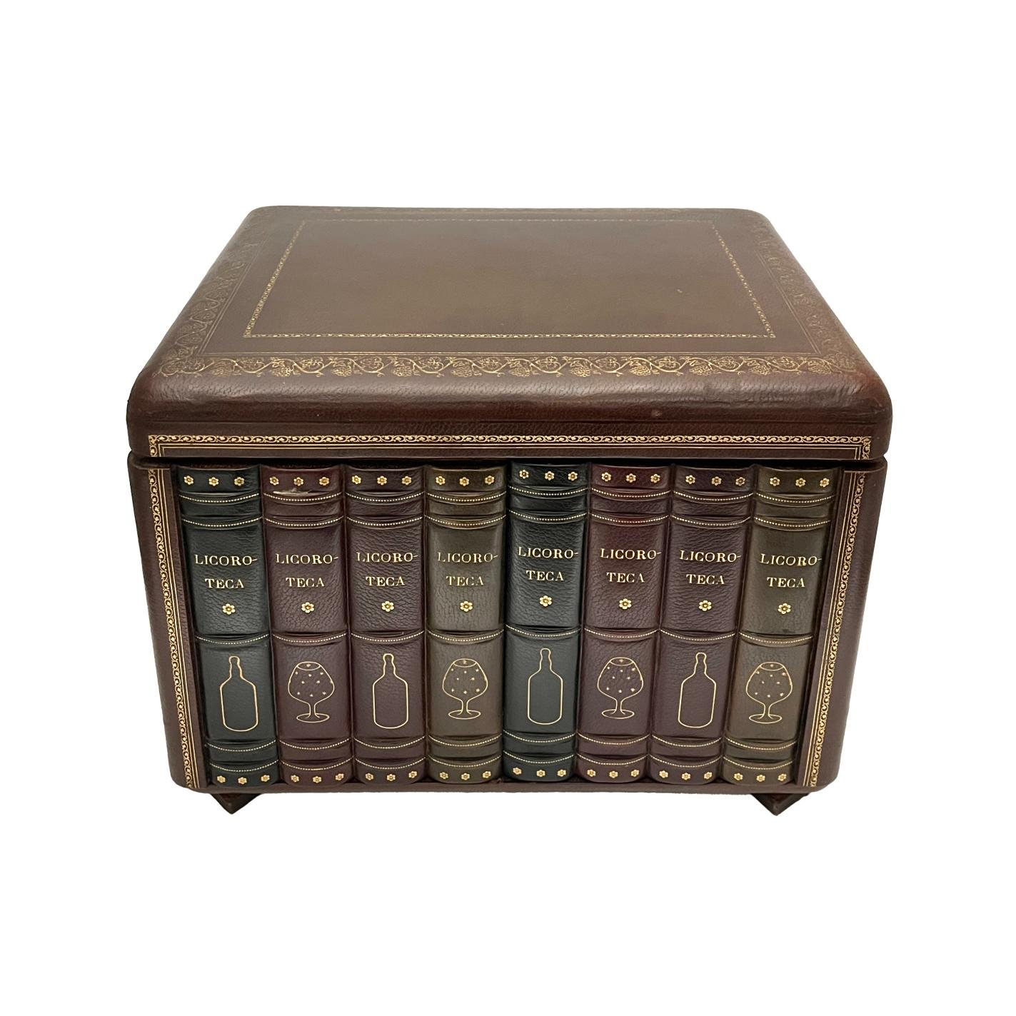 Licorera de sobremesa en madera forrada en cuero con viñetas doradas, con puertas frontales decoradas «lomos de libros». Interior con dos cajones, depósito para cigarros, dos botellones cuadrados en cristal tallado (alto 22 cm) y cuatro vasos en cristal tallado (alto 6 cm). 27 x 37 x 28 cm.